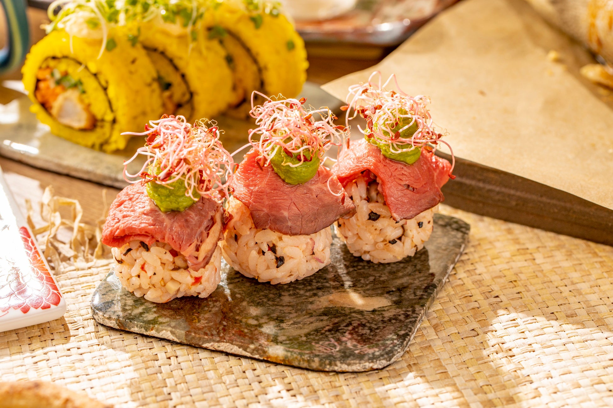 野菜入りの洋風酢飯をローストビーフで包んだ手毬寿司。碧南白醤油を塗り、わさび香るアボカドディップを添えて。