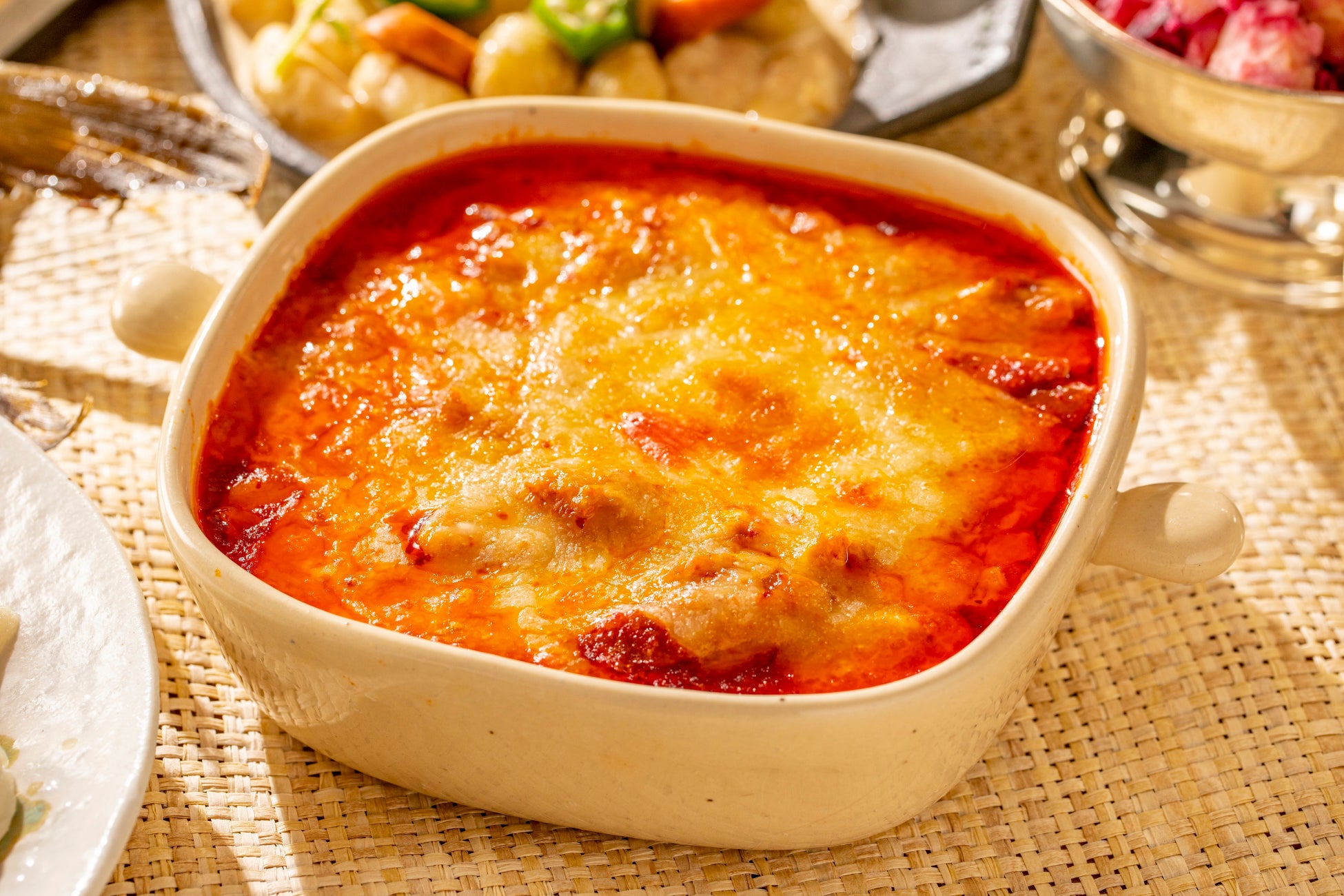 コチュジャンやコーンシロップの辛さやうま味・甘みと、トックとチーズのまろやかさやコクのある韓国風スパイシーチキン。