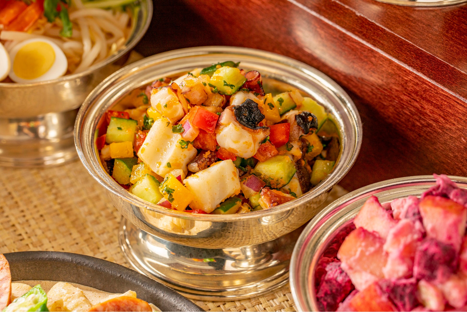タコとイカをポキサラダ風に。南知多町産のうすあまたまり醤油の口当たりの良い甘さと、三重県産九鬼(くき)ごま油の力強いゴマの香りがやみつきになる一品。