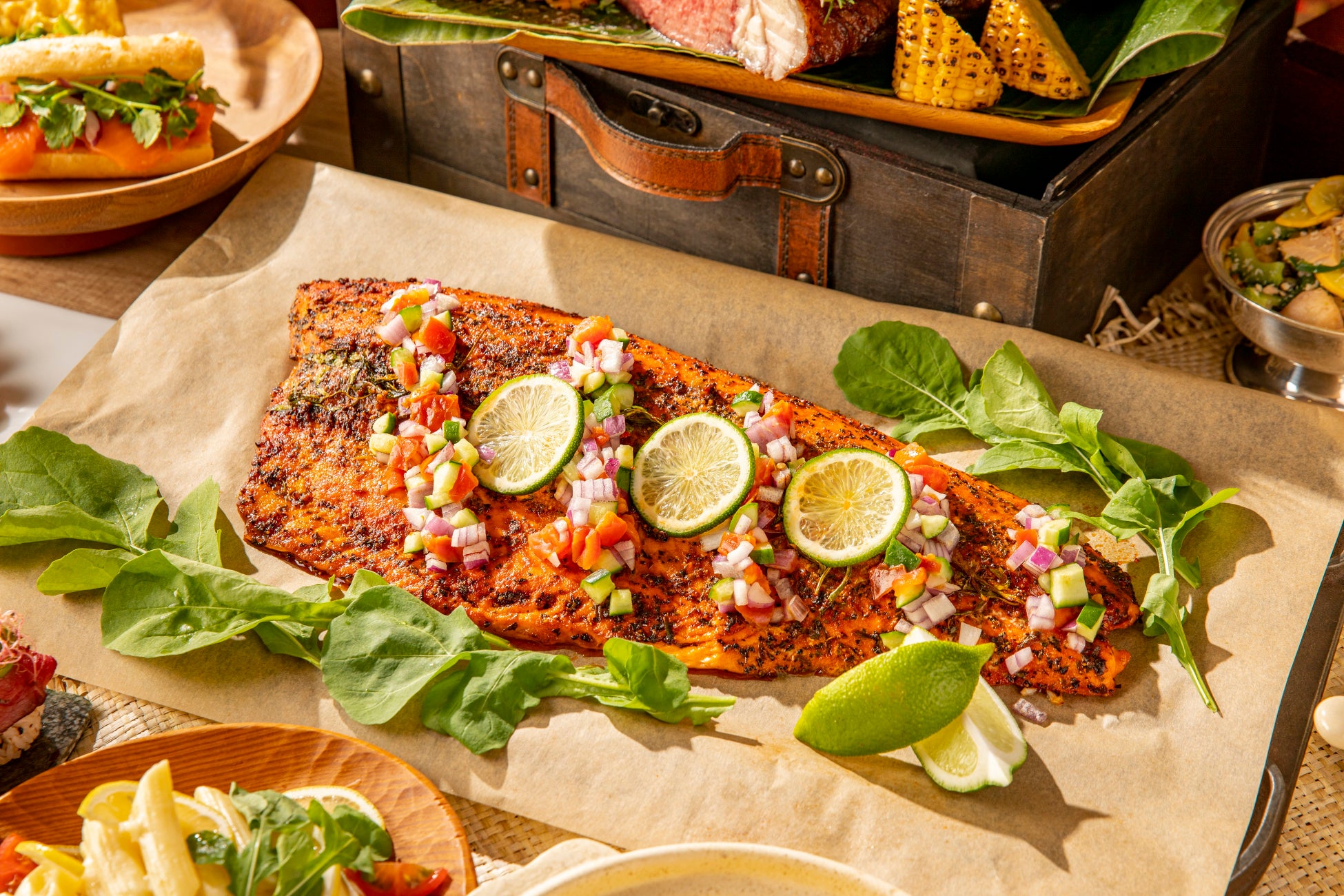 パプリカパウダーなどのスパイス数種類を使用して夏らしく仕上げたサーモンを、夏野菜とタラゴンのさっぱりとしたサルサソースと一緒に。
