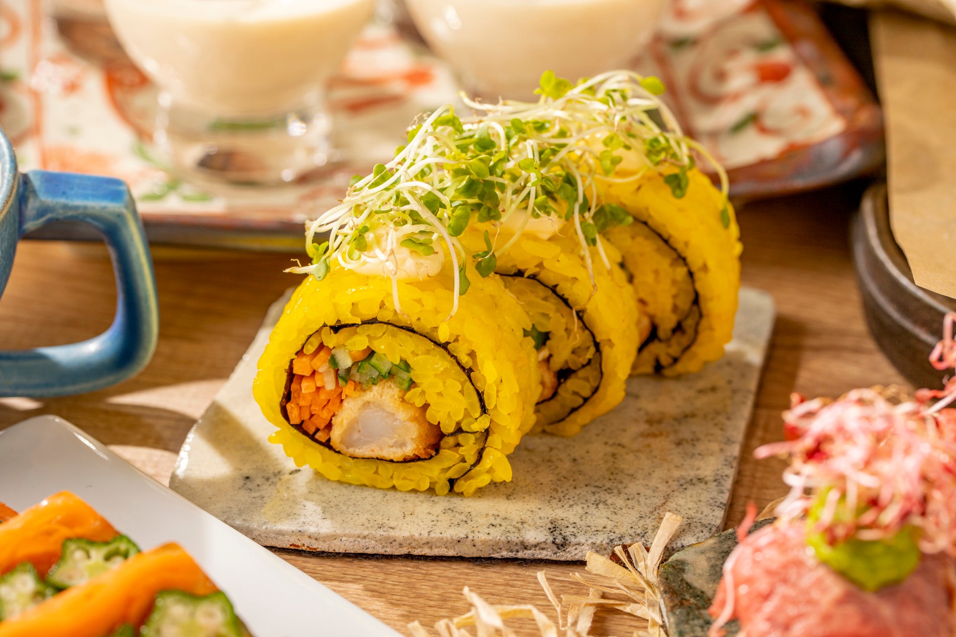 名古屋名物エビフライをカリフォルニアロール仕立てに。バルサミコで炊いた自家製伽羅蕗(きゃらぶき)を添えて。