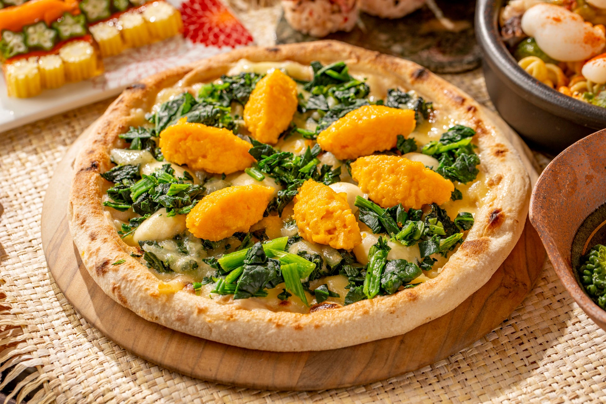 三河しろたまりで味付けしたほうれん草のソテーとスクランブルエッグの素材の味を生かしたピザ。