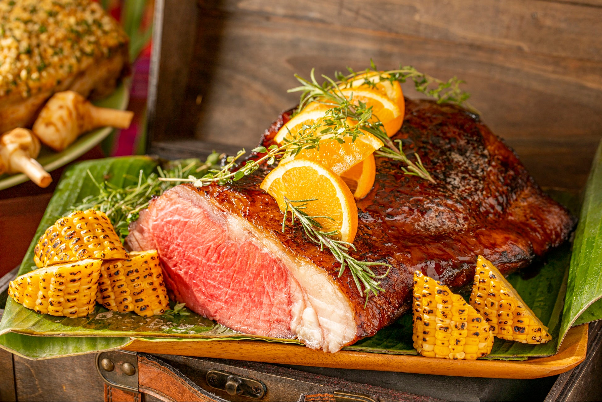 ソースにオレンジジュースを加えて仕上げたローストビーフ。玉蜀黍はまろやかで深いコクのある醤油を塗り、香ばしく焼き上げた上品な味わい。