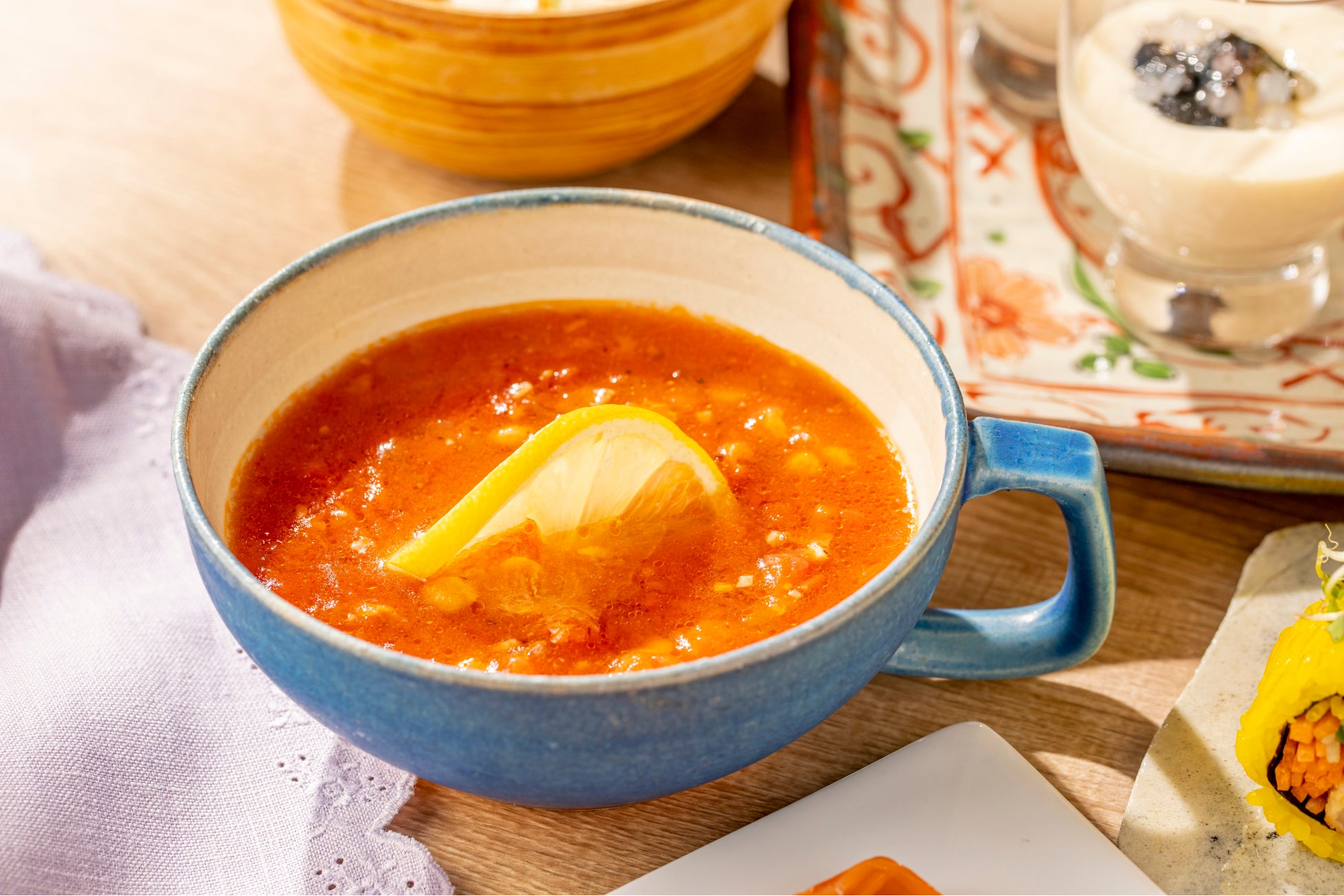 イエローレンティル豆やベーコンのうま味に安城産の白だしでより深い味わいに。レモンの酸味でさっぱりとした、夏にぴったりなスープ。