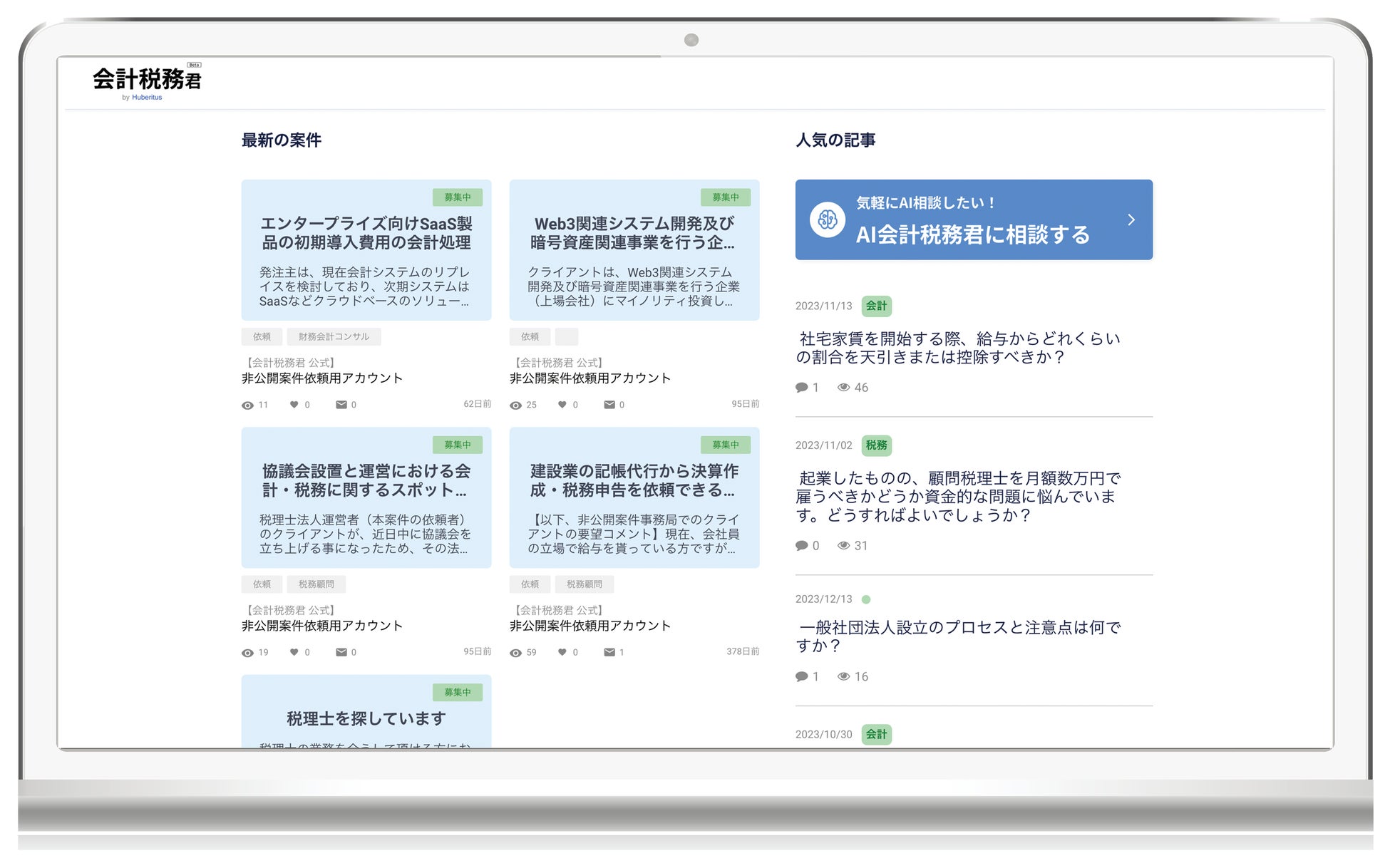 シースリーレーヴ株式会社(本社:東京都港区、代表取締役社長:空野正輝)は、Huberitus株式会社様よりリリースされた、会計士・税理士とユーザーを繋ぐプラットフォームサービス「会計税務君」及び、生成AIを活用した会計・税務に関するAI相談サービス「AI会計税務君(β版)」をノーコードBubbleにて開発しました。