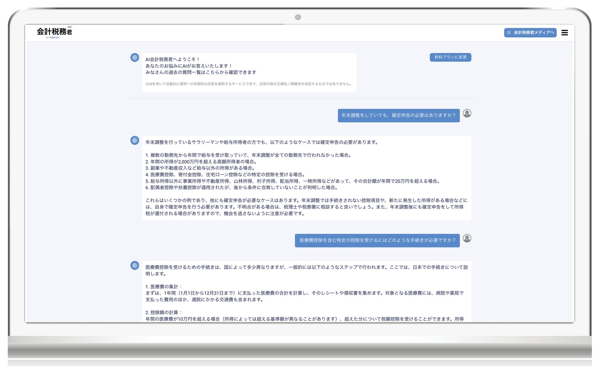 AI会計税務くんは、最新AI技術を活用した、会計・税務に関する質問に自動で回答するサービスです。