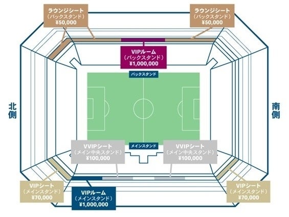 ・VVIPシート(メイン中央スタンド):100,000円(ラウンジ(着席)・食事・フリードリンク付き)