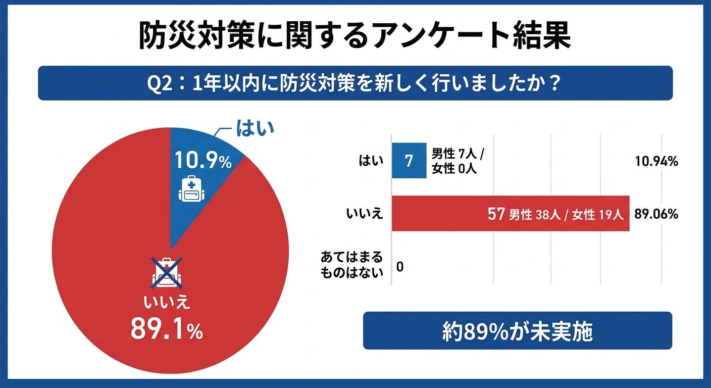 防災グッズ更新、避難経路見直しといった日常的な行動が行われていない現状が確認されました。