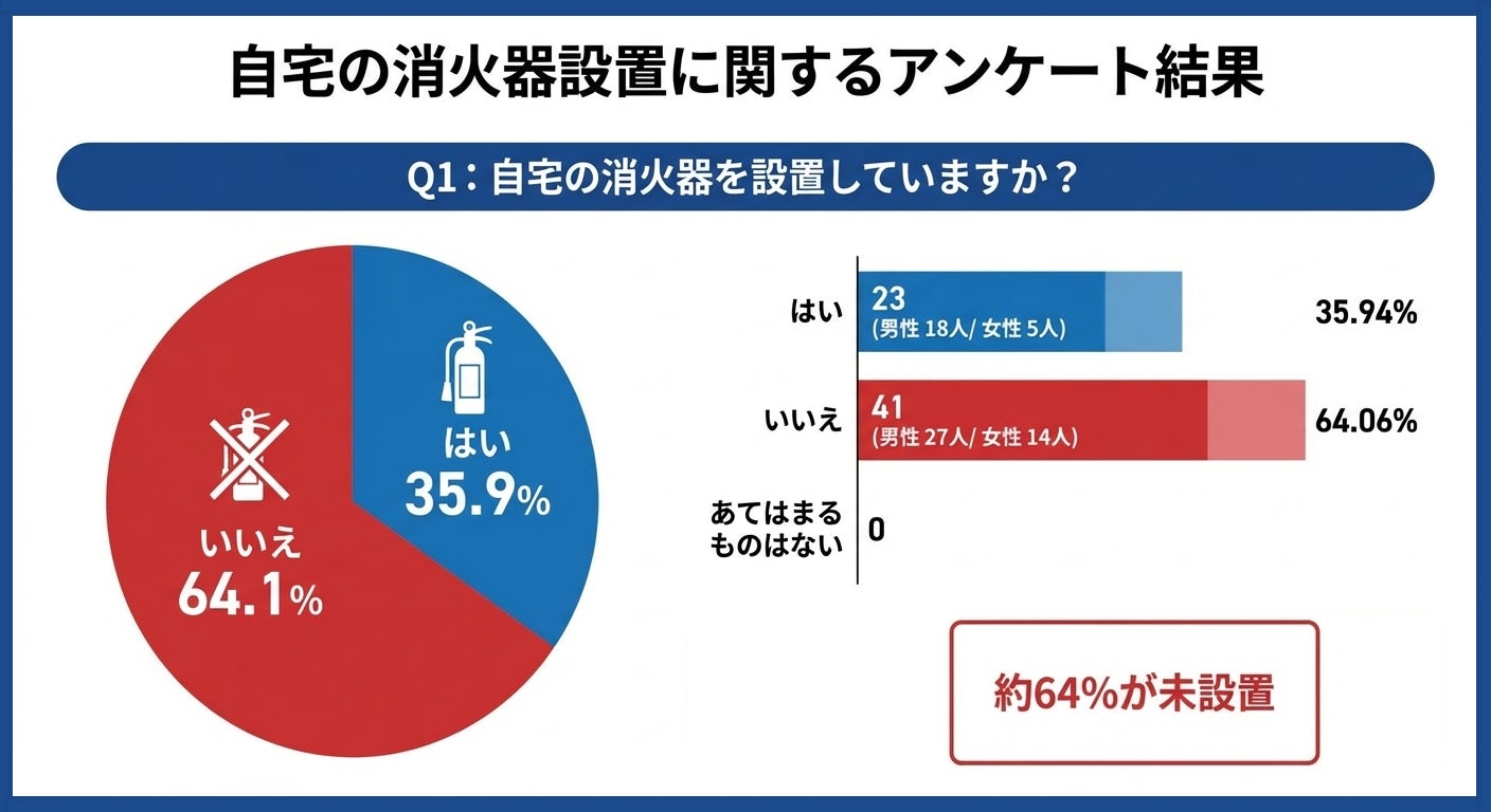 自宅に消火器を備えているか尋ねたところ、「はい」は23名にとどまり、「いいえ」が41名(64%)と多数派でした。消火器は初期消火の要ですが、その重要性が十分に家庭内に浸透していないことが明らかです。