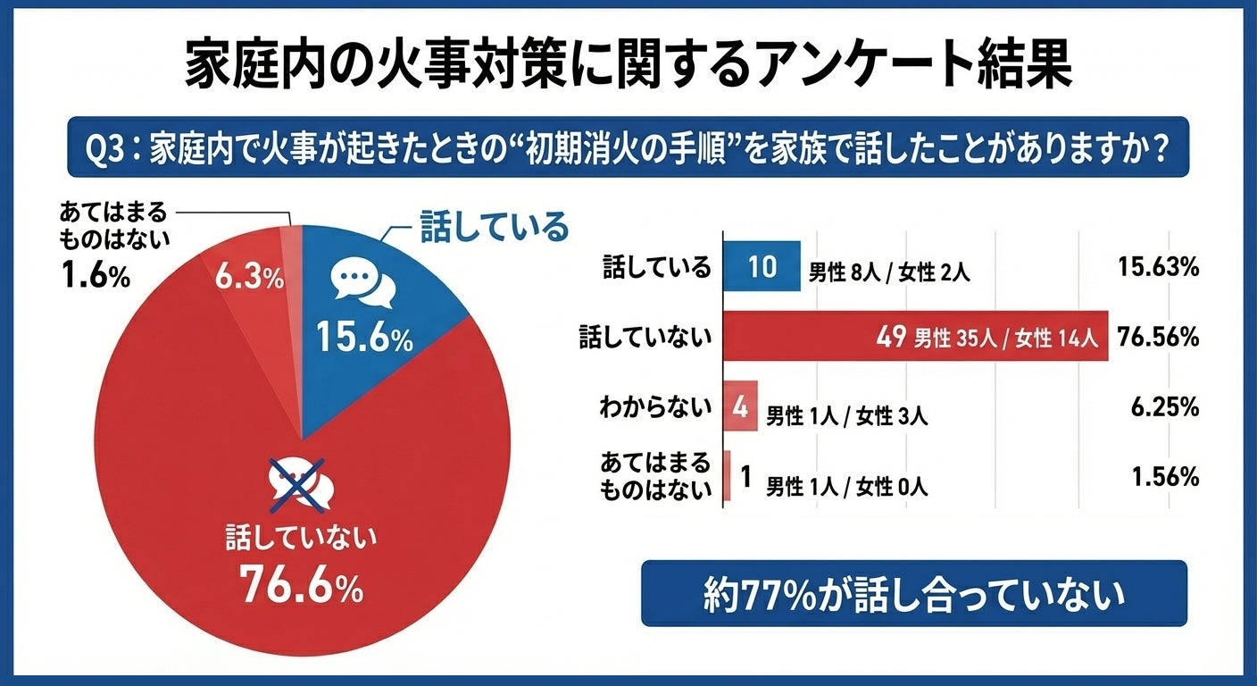 家庭内で火災が発生した際、誰が何をするかを「家族で話し合ったことがある」と回答したのは10名(15.6%)。「話していない」が49名と大多数で、緊急時の行動が全く共有されていない可能性が高い結果となりました。