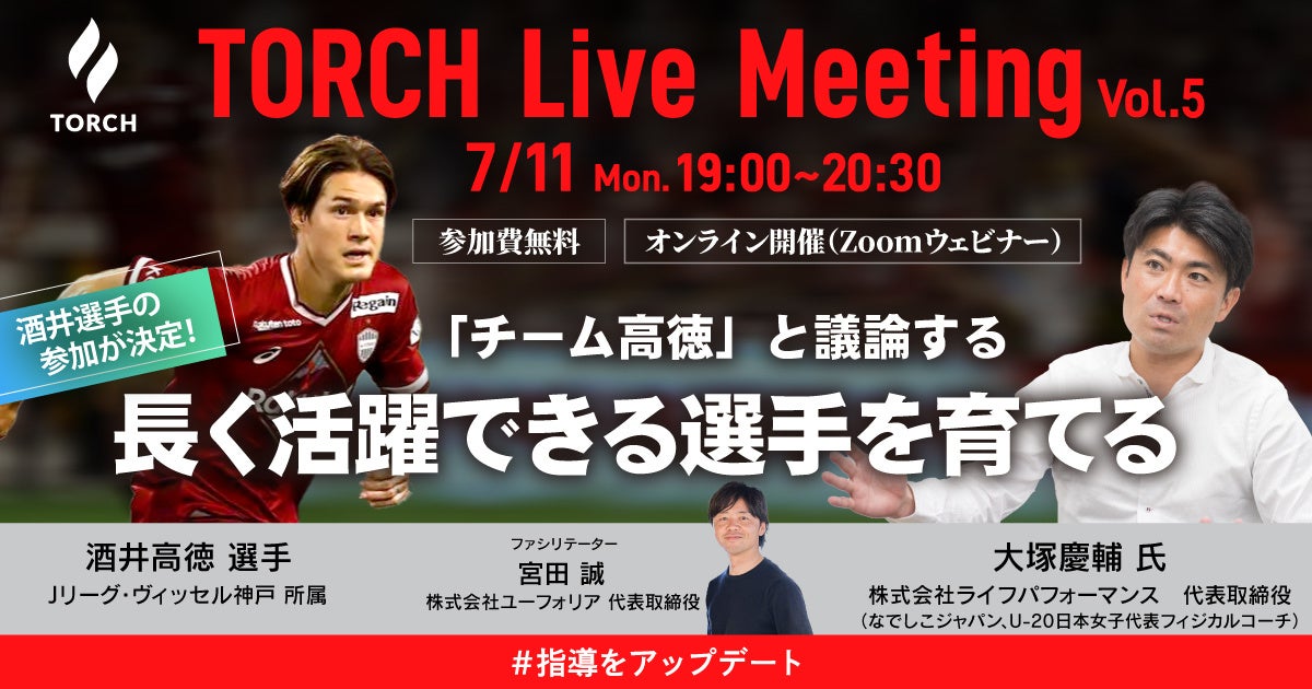 今回のTORCH Live Meetingでは、ヴィッセル神戸所属の現役Jリーグ選手の酒井高徳さんと、高校生の頃から酒井高徳選手を知る大塚慶輔コーチ(現なでしこジャパン、U-20日本女子代表フィジカルコーチ)にご登壇いただき、酒井選手の育成年代やご自身の経験も交ながら、長く活躍できる選手になるための要点、そんな選手を育てる秘訣、をディスカッションします。育成年代の指導に携わる指導者の方、育成年代の保護者の皆さんにとっては、見逃せない一夜となるはずです!
