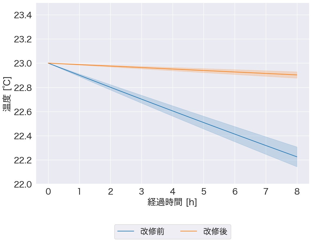 初期室内温度23℃、屋外温度13℃一定、内外温度差による熱移動のみと仮定としたシミュレーションでは、改修前では8時間後に約1 ℃気温が下がるのに対して、改修後は0.1℃程度に温度が保たれる。