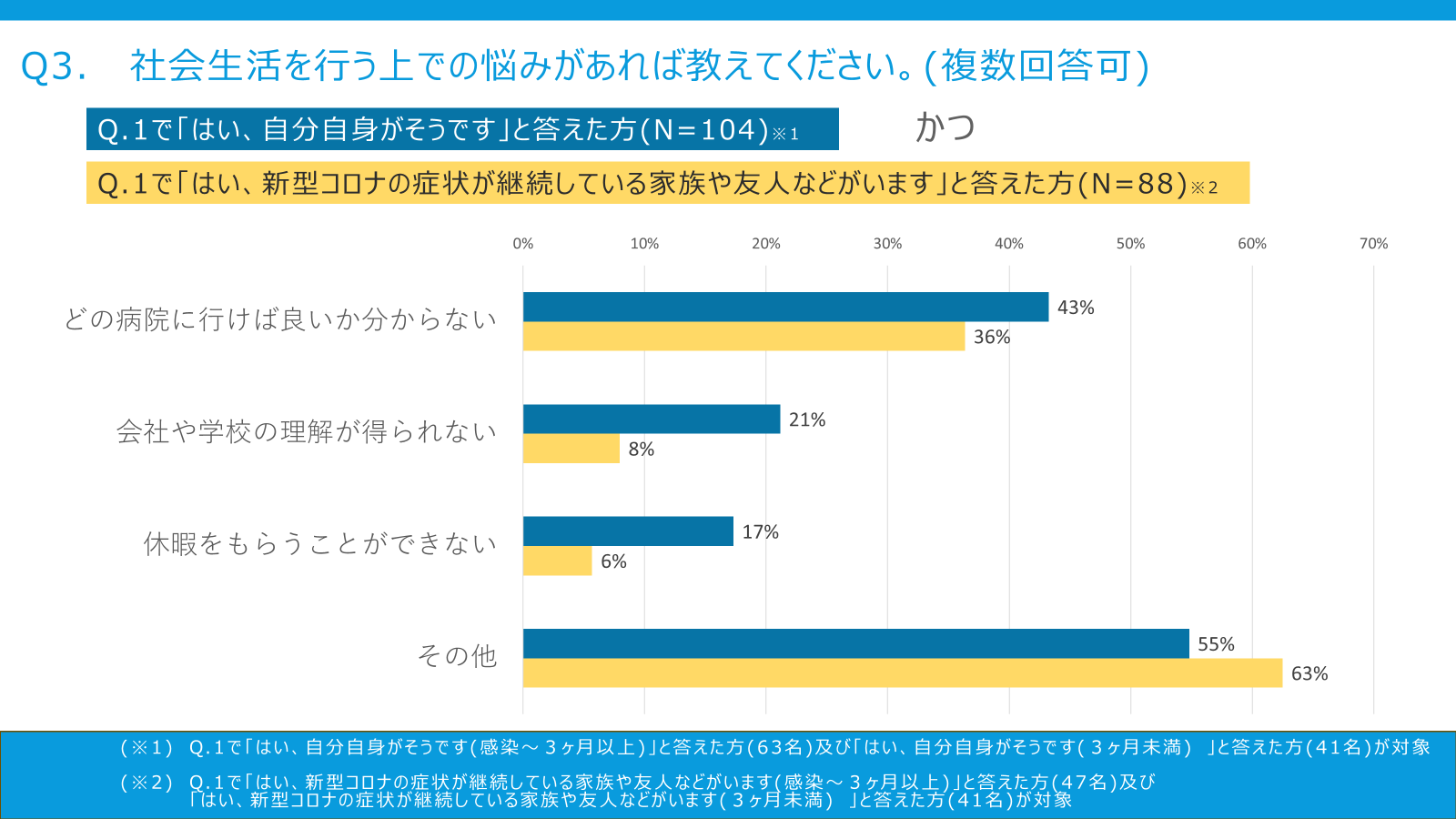 社会生活上の問題として最も多いのは「受診先が分からない」というものでした。後遺症外来を地域ごとに設置することが望ましいと考えられます。
