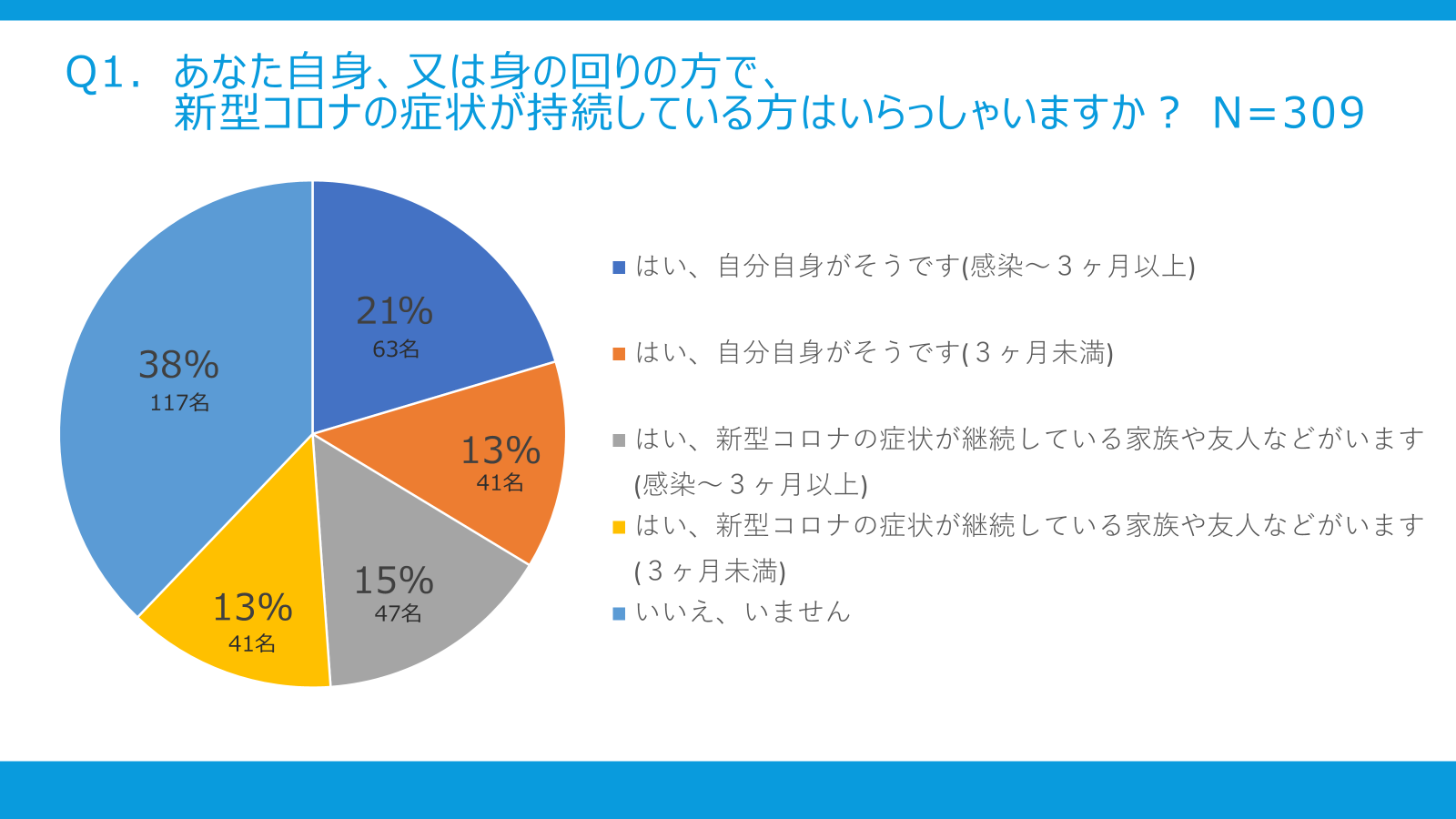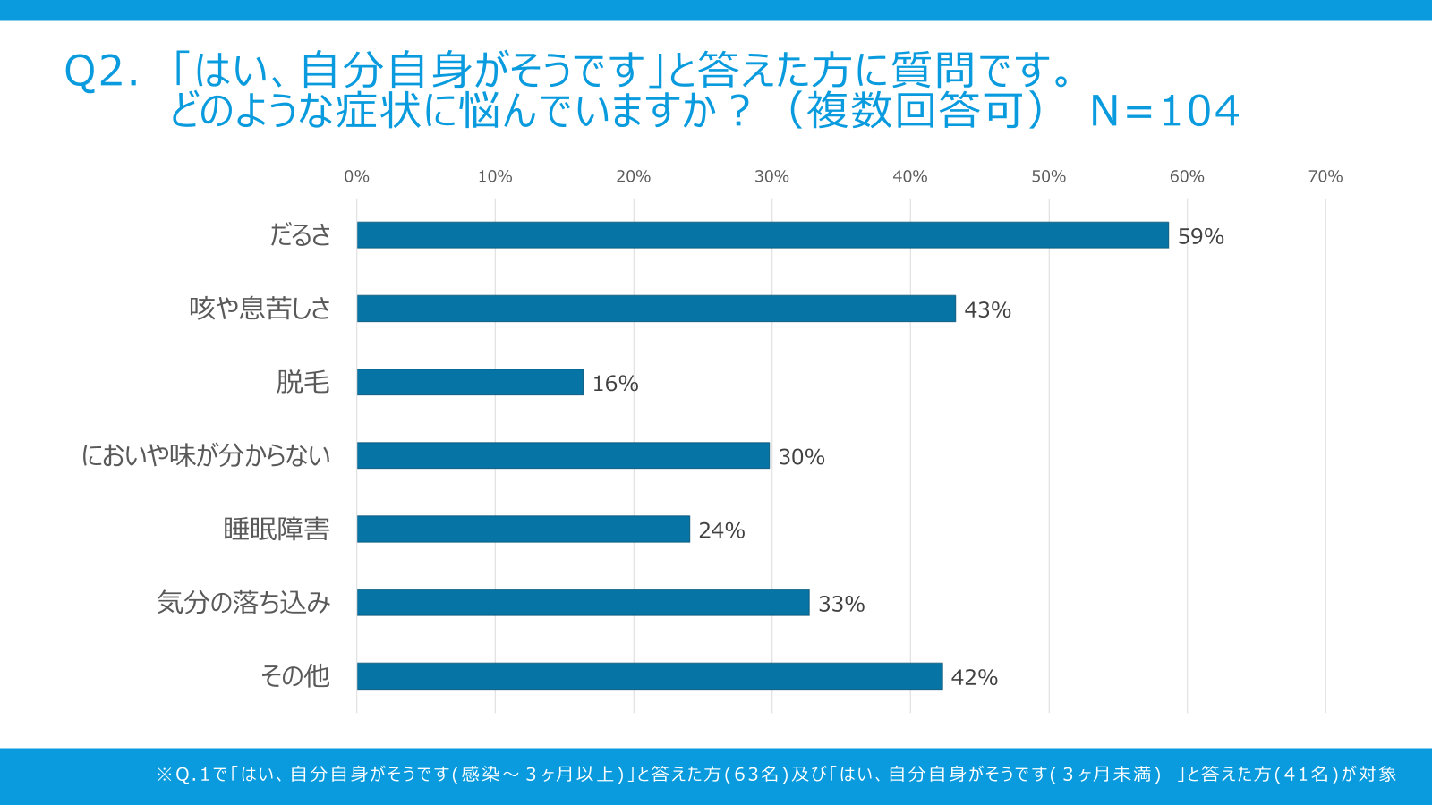 アンケートの結果より、調査時点で34%の方が自分自身の後遺症の問題に悩まされており、28%の方は周囲の方が後遺症の症状を抱えていると分かりました。症状は、だるさ、咳や息苦しさ、睡眠障害などであり、これまでに知られている後遺症の症状や頻度に一致するものです。