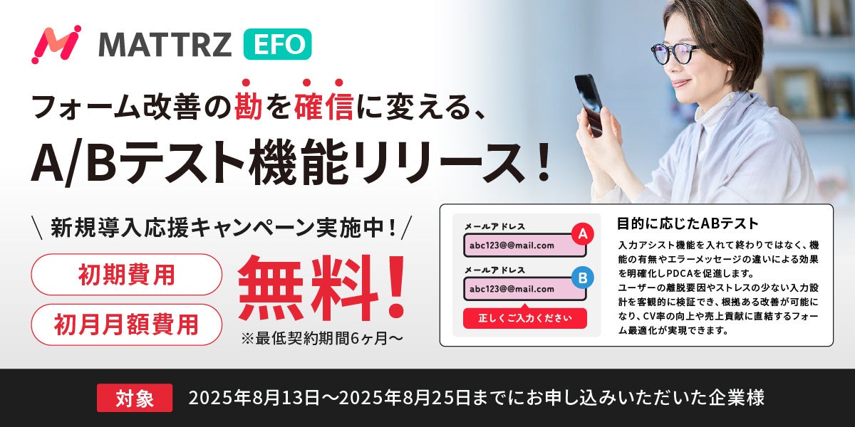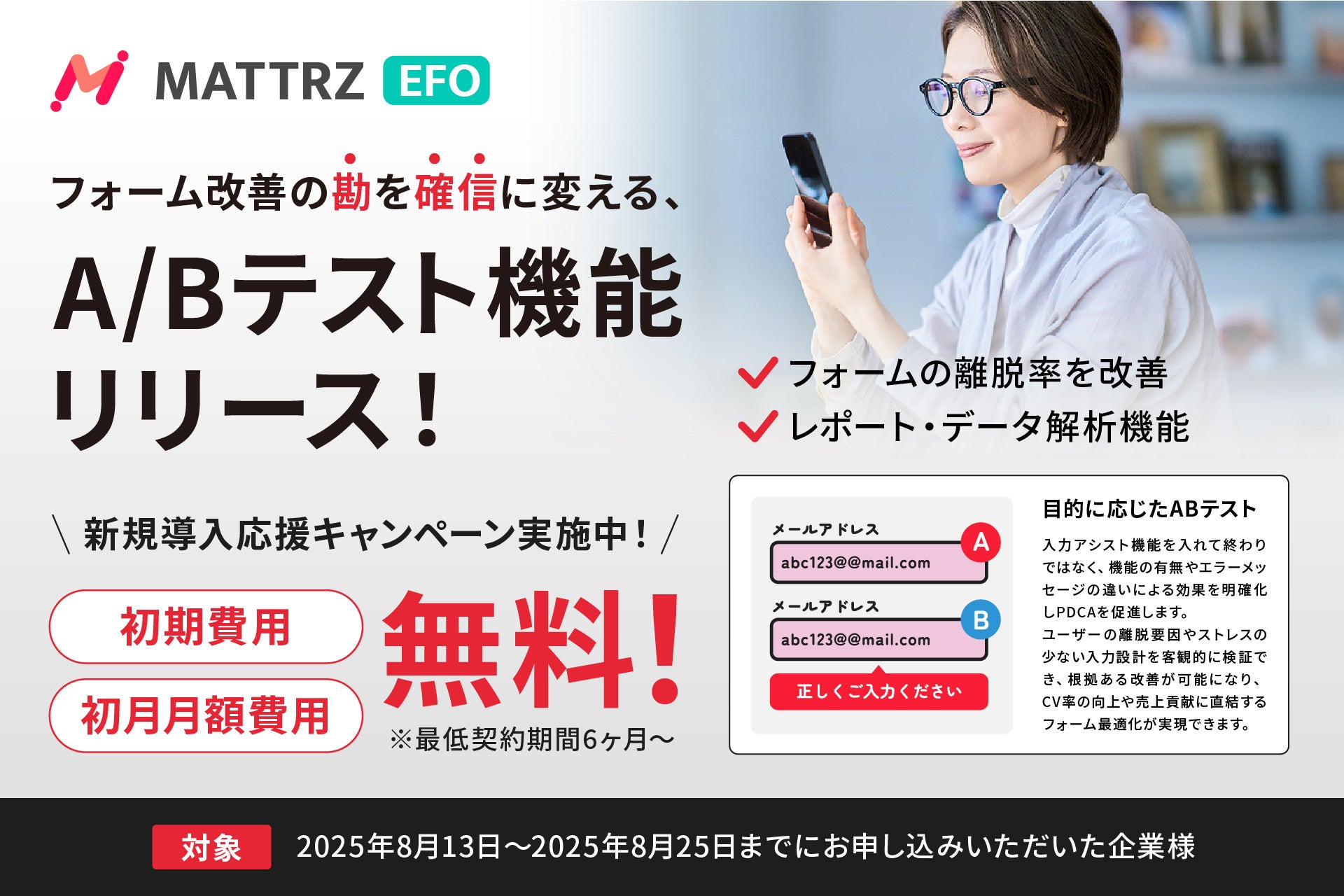 SaaS事業を展開するMattrz株式会社(本社:東京都千代田区、代表取締役:横川慶毅)は、当社が提供するEFOツール「MATTRZ EFO」において、入力フォームの改善効果を検証できる「A/Bテスト機能」を、本日2025年8月13日より提供開始したことをお知らせします。