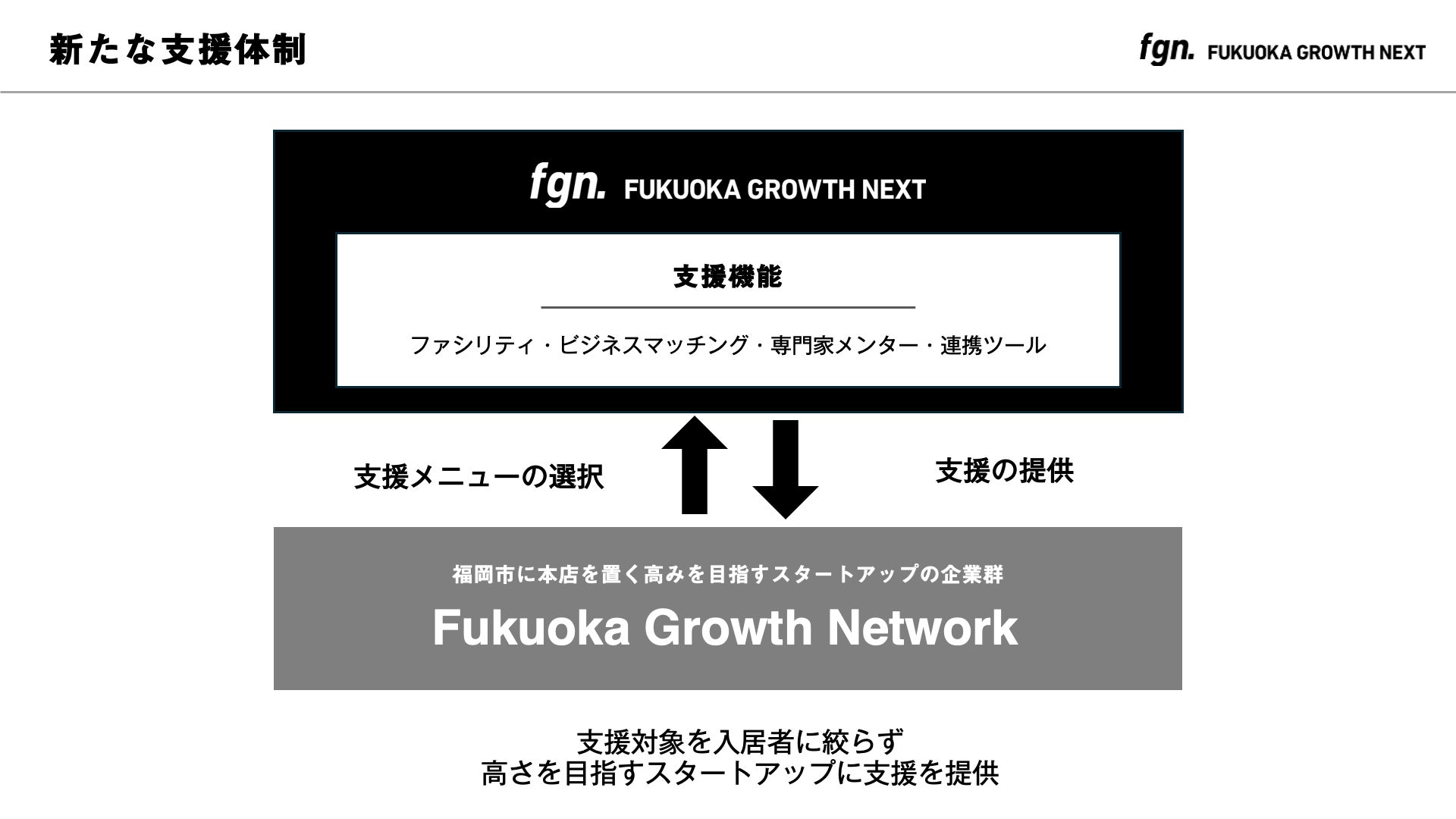 その一環として、FGNが提供するスタートアップ支援メニューを拡充し、さらにその支援対象を福岡市に本店を置くスタートアップに拡大します。これによりFGN入居企業に限らず、成熟したスタートアップや、有望なポテンシャルを持った大学発スタートアップなど、福岡市のスタートアップやその従事者に対して支援を提供することが可能となります。
