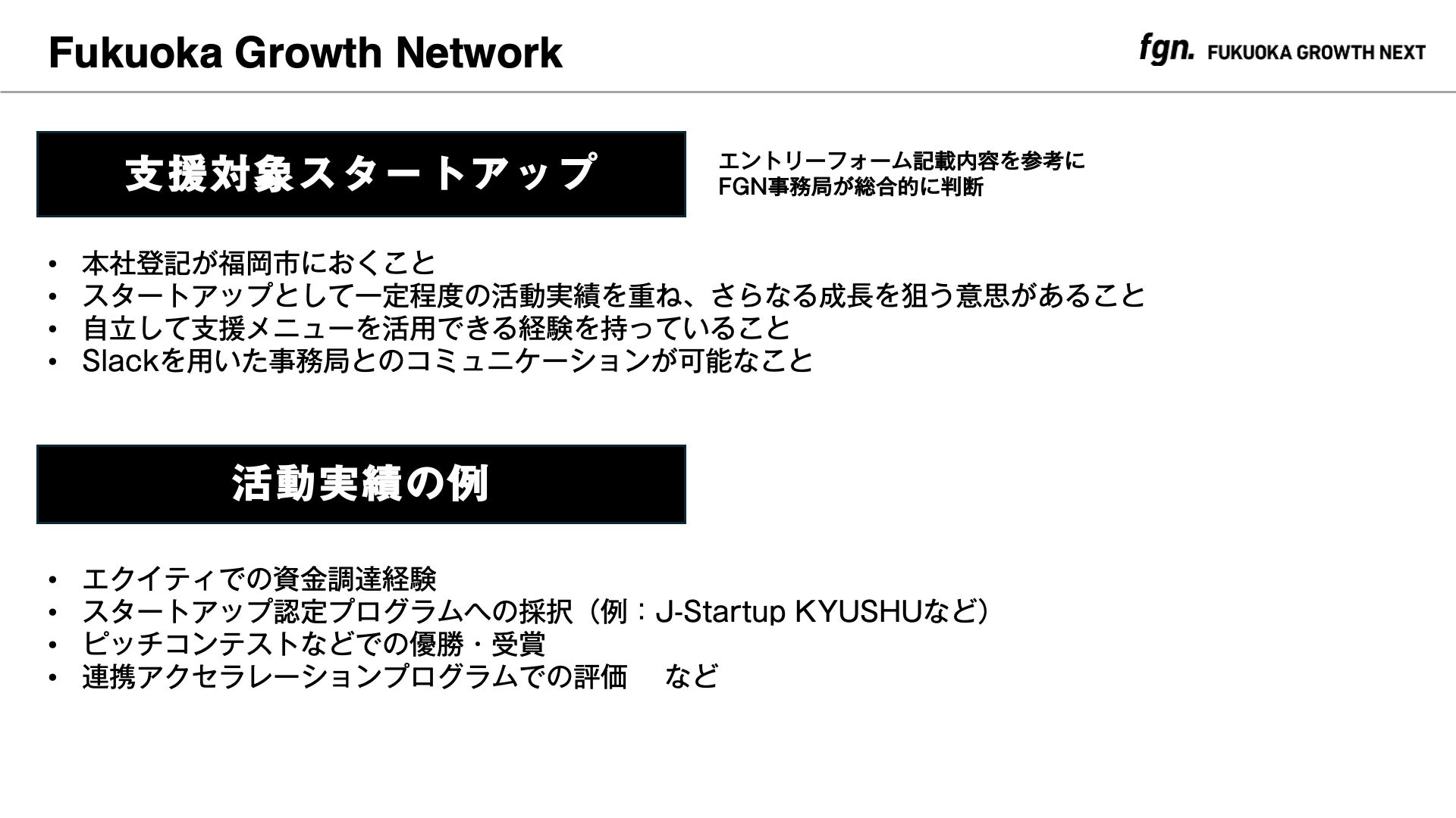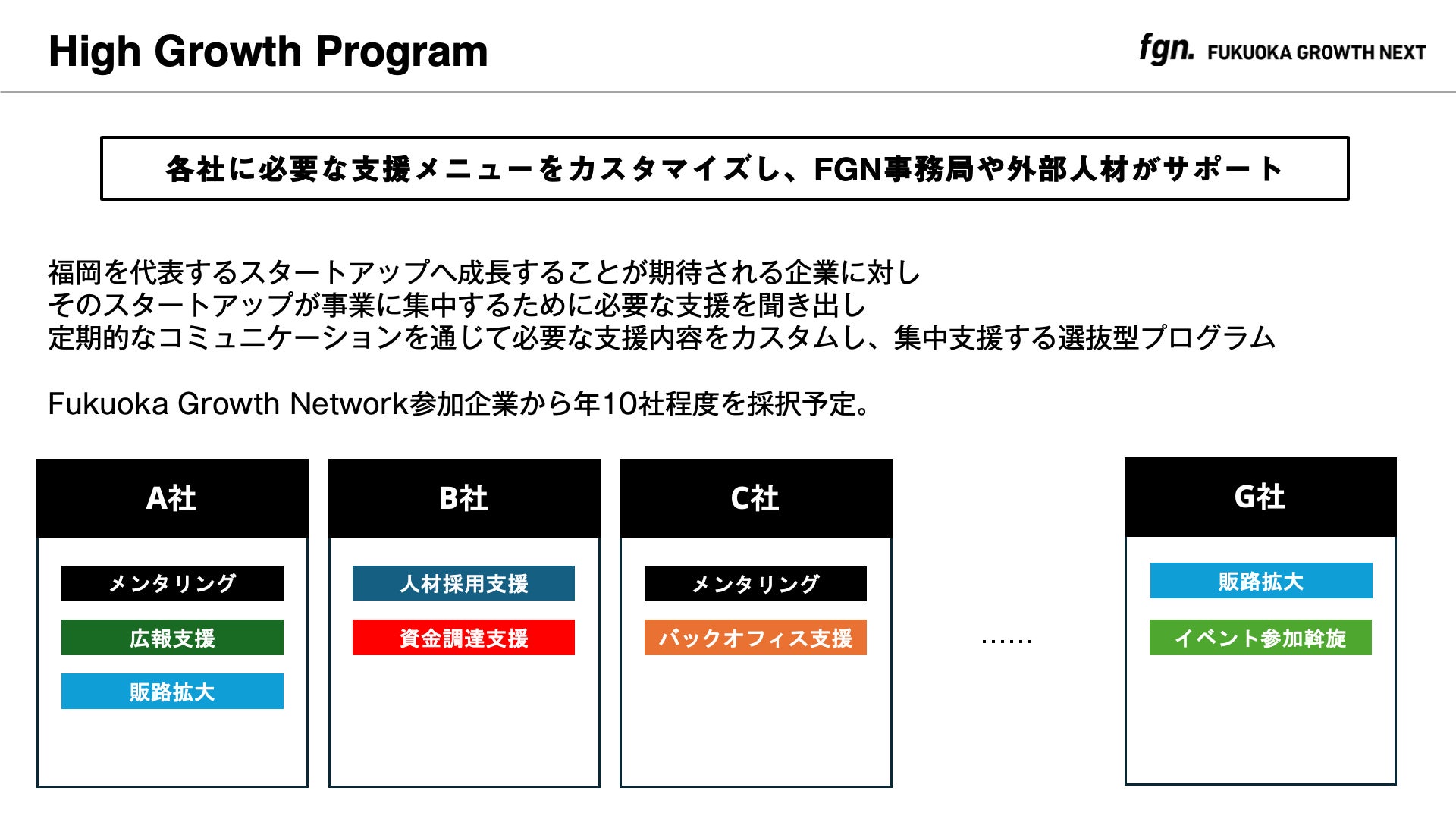 スタートアップとして一定のステージに達したと認定され、さらなる成長を狙う意思のあるスタートアップを「Fukuoka Growth Network(以下FGNet)」としてネットワーク化し、FGN支援メニューを提供し、FGNet参加企業は必要なときに必要な支援メニューにアクセスできます。