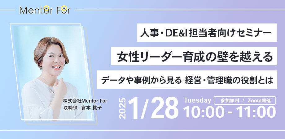 企業のDE&I(Diversity, Equity & Inclusion)・女性活躍推進を目的とした、社外メンターの育成・マッチング・社内メンター制度支援を提供する株式会社Mentor For(東京都渋谷区、代表取締役・池原真佐子、以下Mentor For)は、「女性リーダーの育成における経営層・管理職の役割」をテーマとしたセミナー「女性リーダー育成の壁を超える 〜データや事例から見る経営・管理職の役割とは〜」を2025年1月28日(火)に開催いたします。