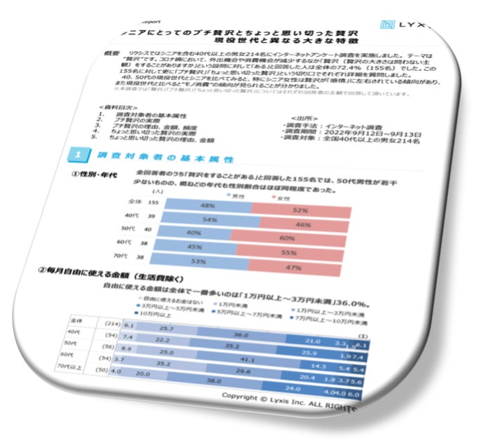 本調査は2022年9月12日〜9月13日に全国の40代以上の男女214名に対して「贅沢」をテーマとしたインターネットアンケートを実施しました。その結果「贅沢をすることがある」(贅沢の大きさは問わず)と答えた155名に対して、更に「プチ贅沢」「ちょっと思い切った贅沢」という切り口でそれぞれ詳細を質問していきました。