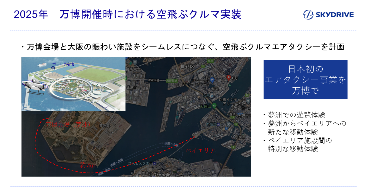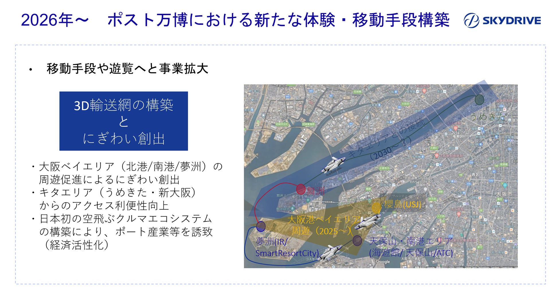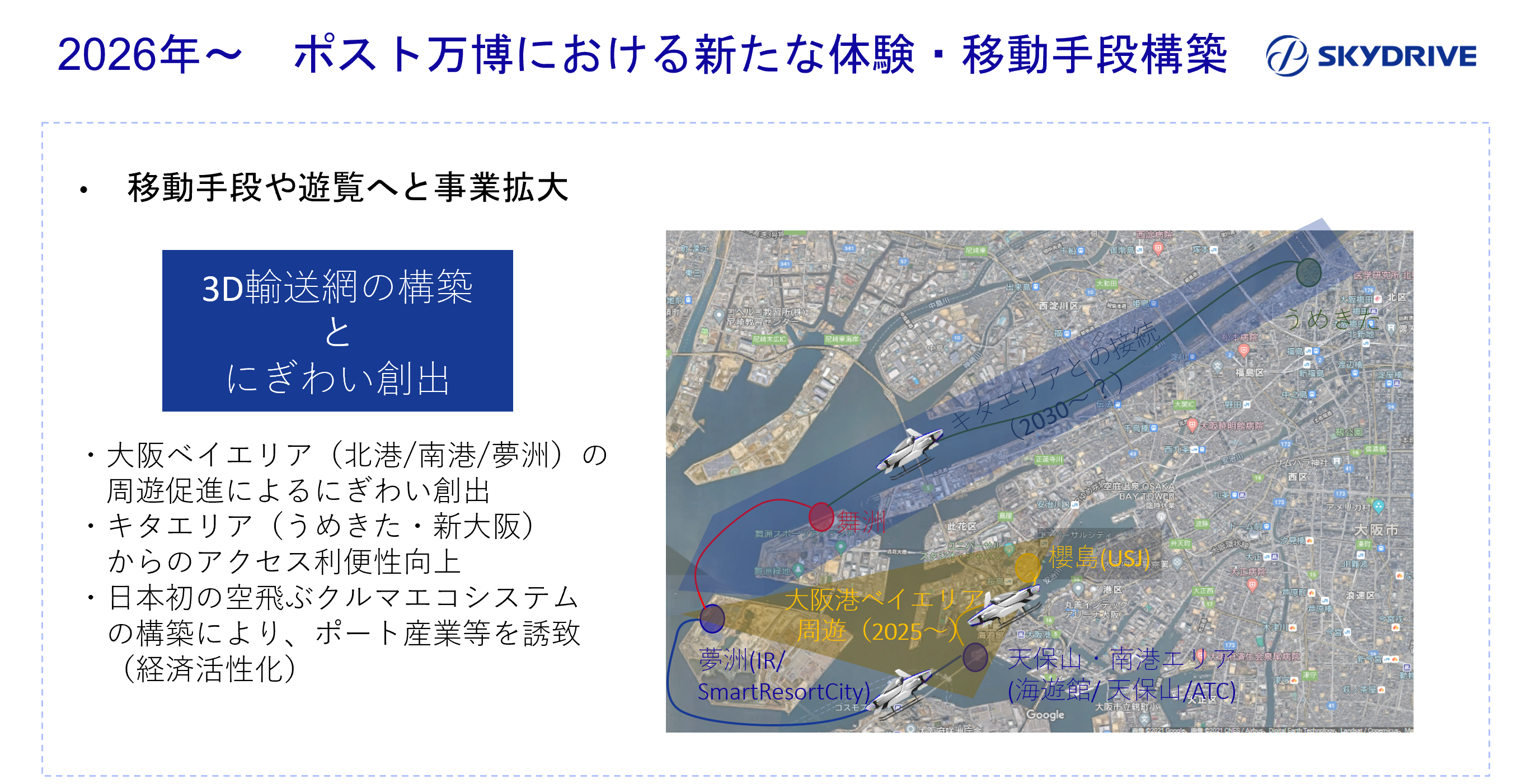 当社は、本「大阪版ロードマップ」に沿って、社会受容性の向上と技術検証を重ね、2025年の大阪・関西万博時における空飛ぶクルマのエアタクシー事業をスタートに、2026年以降の事業拡大に繋げて参ります。