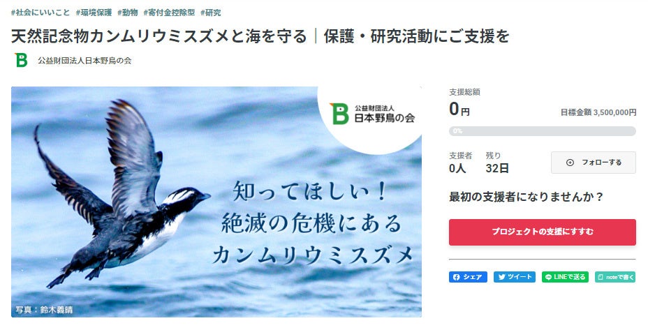 公益財団法人日本野鳥の会(事務局:東京、会長:上田恵介、会員・サポーター数約5万人)は、2022年8月29日(月)9時から9月30日(金)23時まで、クラウドファンディングサイト「READYFOR」にて、天然記念物の海鳥カンムリウミスズメ保護活動の資金調達を行います。