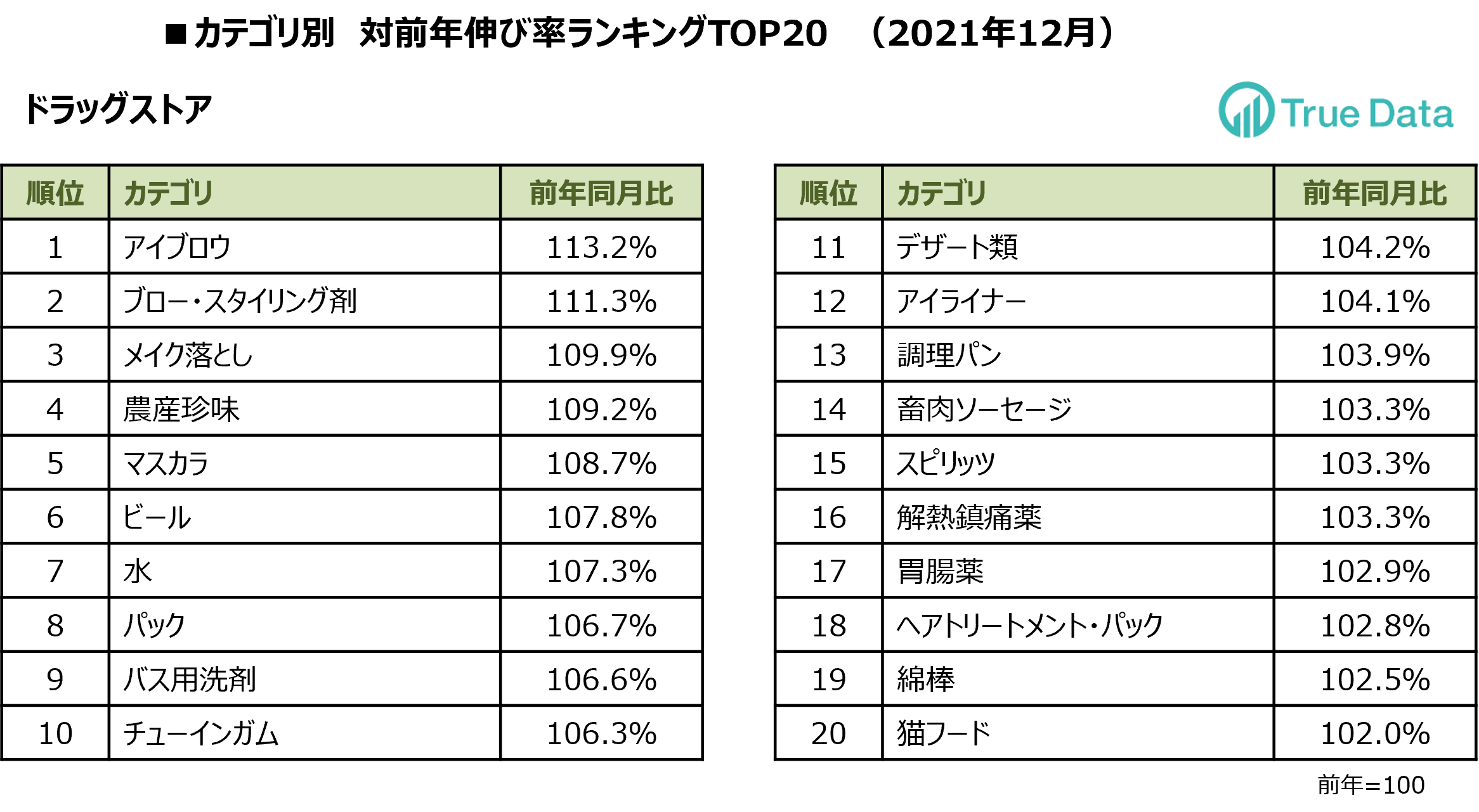 株式会社True Data(トゥルーデータ/本社:東京都港区、代表取締役社長:米倉 裕之) は、当社の統計データをもとに、ドラッグストア、食品スーパーマーケットにおける2021年12月の売り上げ伸長カテゴリを発表します。ドラッグストアでは、アイメイクのカテゴリ「アイブロウ」、「マスカラ」、「アイライナー」や、ヘアケアのカテゴリ「ブロー・スタイリング剤」、「ヘアトリートメント・パック」の売り上げが前年同月に比べ伸長しました。12月前半は、全国の新型コロナ新規感染者数が100人台までで抑えられていた為、外出の機会が増え、マスク生活で注目されるアイメイクや、ヘア関連商品の売り上げが増加したと考えられます。
