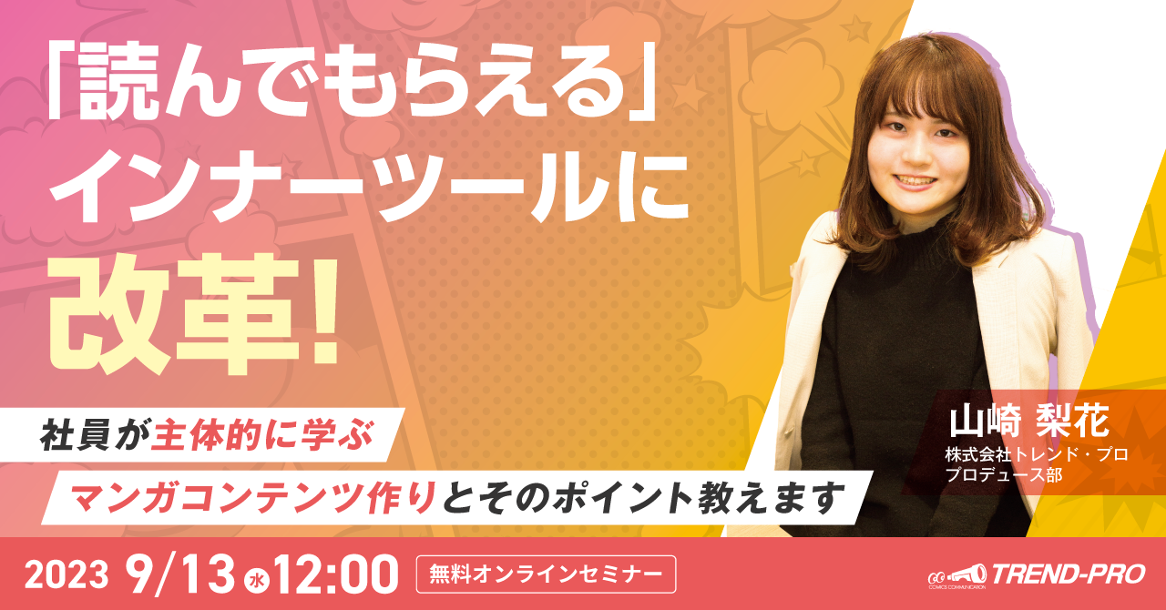 こうした課題を受け、約2,000社・10,000件の企業マンガ制作の実績があるトレンド・プロが、企業内の研修や施策浸透に有効なマンガツールについて、制作のポイントや事例をお伝えするオンラインセミナーを実施します。