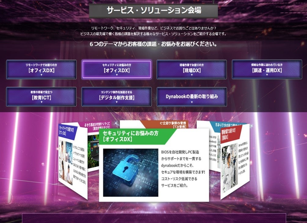 ・オフィスDXや現場DXといった、企業や法人の様々な課題解決につながる各種DXソリューションや、ハイブリッドワークをサポートする最新デバイスなど、様々なアイテムをオンライン展示にてご紹介。