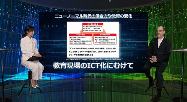 続いて、教育現場から見た日本のICT化について、カナダやアメリカ合衆国では既にAIのコードを書けるようにするプログラム教育があるということに触れながら、先生のICT化も重要であり日本の子供たちが海外の子供たちと、どのように教育を受けるかが教育イノベーションの核になると語っています。