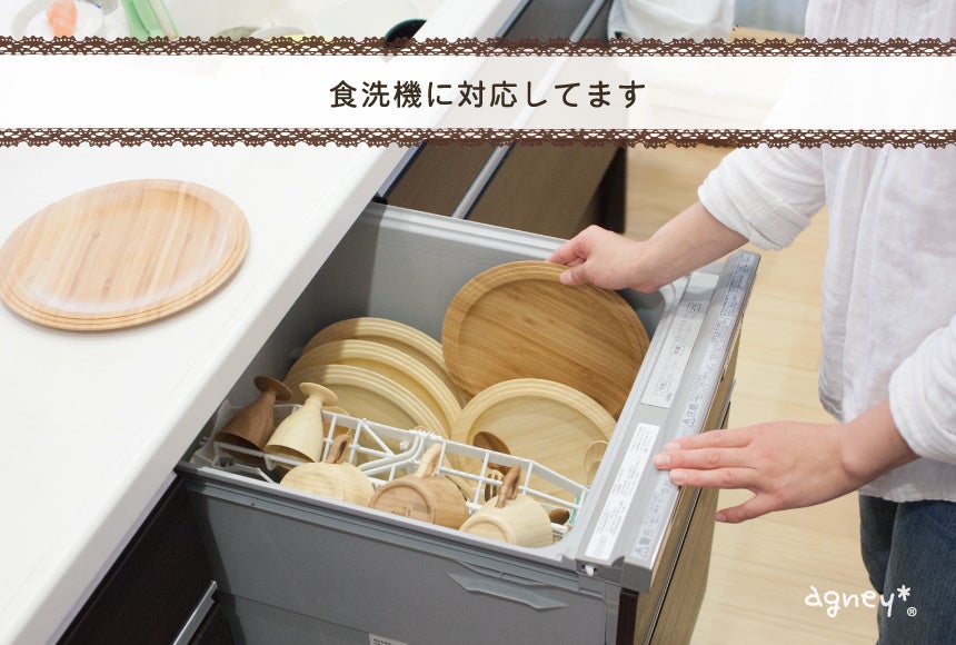 また、全ての食器類は、一般財団法人 日本食品分析センターによる試験結果をクリアし、天然緑茶成分配合の塗料と天然素材の持つフィトンチッド*の相乗効果で「大腸菌・黄色ブドウ球菌の抑制」を実証した独自開発のコーティング技術(食品衛生法適合塗料)を施した製品です。6層にも及ぶコーティングは、コーヒーやワインなどの色の濃い飲み物や料理にも安心してご利用いただけます。さらに、これまで使用できなかった食洗機にも対応。天然素材食器では稀にみる食器洗い乾燥機耐久テストに合格。陶器やガラス製食器と変わらず、食器用中性洗剤で洗うことが可能なことも大きな特徴です。