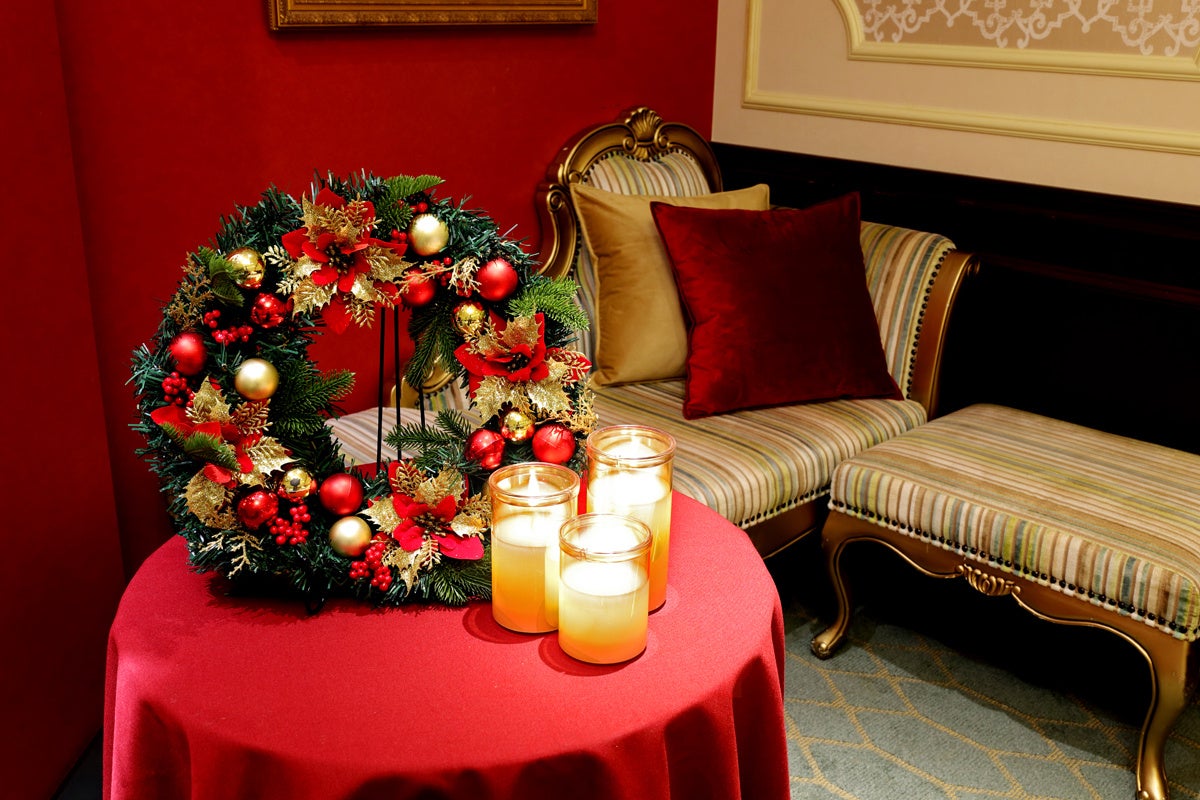 赤・緑・白の鮮やかなクリスマスカラーをベースに天井に舞う雪、夜空に輝く星の美しさに由来するシャンパンゴールドのイルミネーションや、ポインセチアの花言葉である「幸運を祈る」気持ちに寄り添うようなあたたかみのあるキャンドルライトにより華やかなきらめきに包まれます。