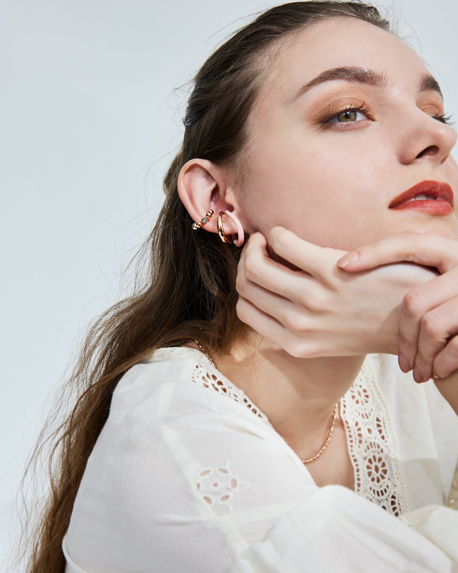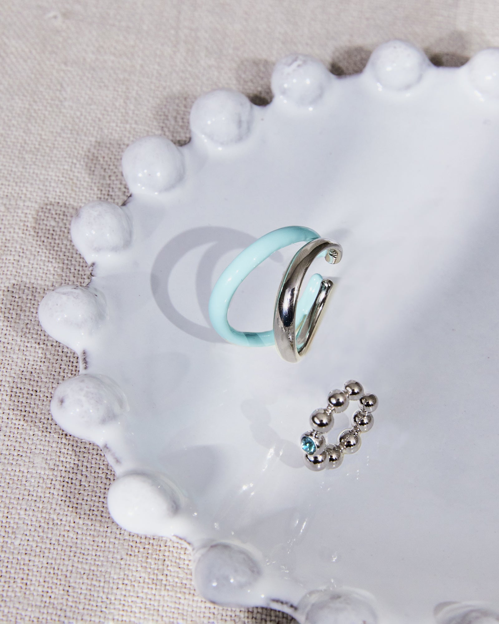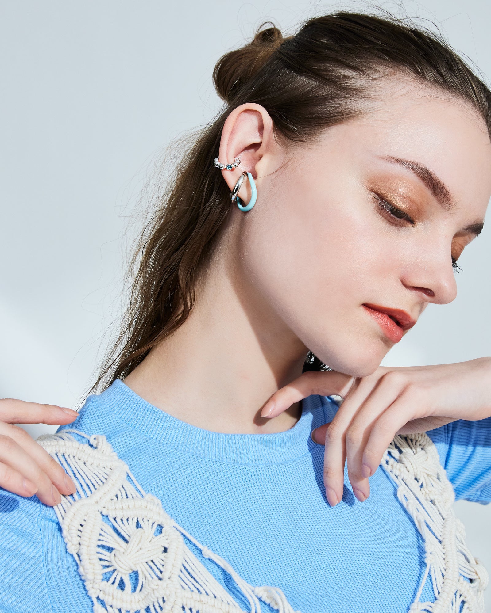パステルブルーのカラーコーティングを施したイヤーカフ兼リングと、ブルーのカットガラスが1石輝くイヤーカフの2点セット。 爽やかなブルーとシルバーカラーが顔周りをクールな印象に仕上げます。