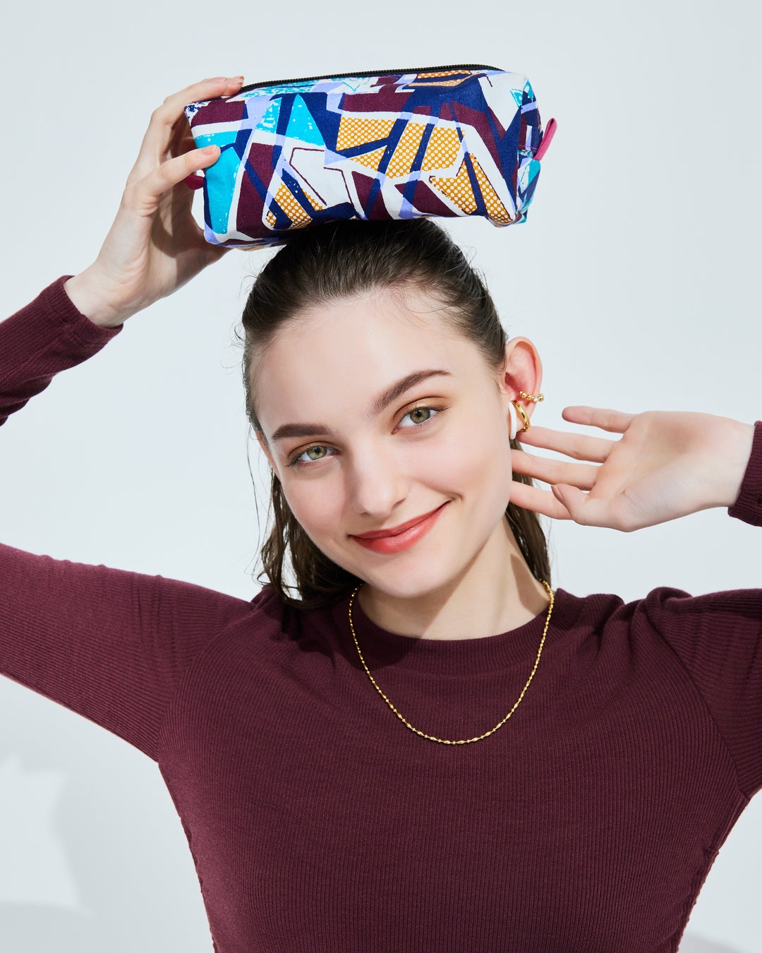 ウガンダの雄大な大地の色や赤道直下のビクトリア湖の水の色をイメージしたポーチには、イエローゴールドカラーのアクセサリーがセット。目を引くピュアホワイトがコーディネートのアクセントになり、顔周りを明るく輝かせます。