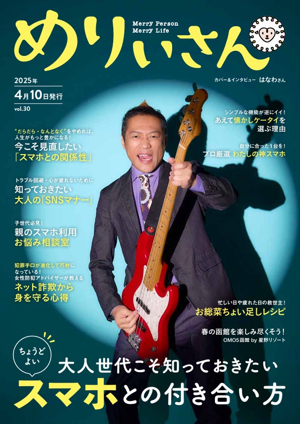 特集「大人世代こそ知っておきたい ちょうどよいスマホとの付き合い方」/表紙&インタビューは芸人・はなわさん/情報誌『めりぃさん』vol.30 4月10日発刊