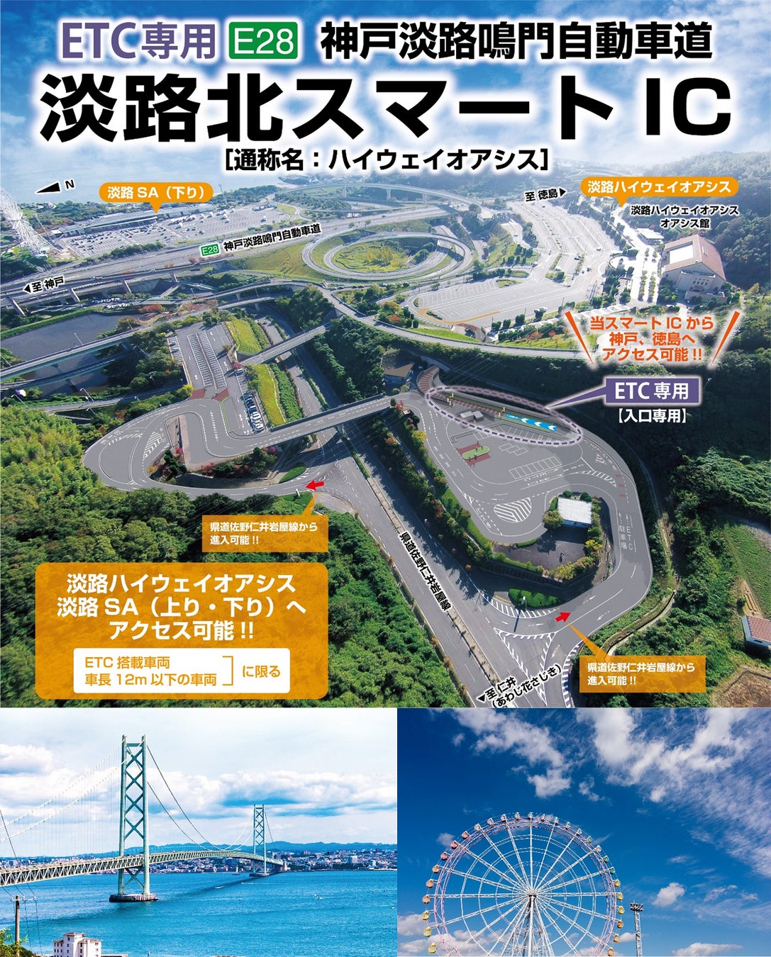 これにより、淡路島内からは、本スマートインターチェンジを入口として、淡路ハイウェイオアシス・淡路SAで食事や買い物をした後、高速道路本線に乗ることができるほか、本線を通行せず淡路インターチェンジから出ることもできます(但し、ETC車載器を搭載した車長12m以下の利用に限られます)。