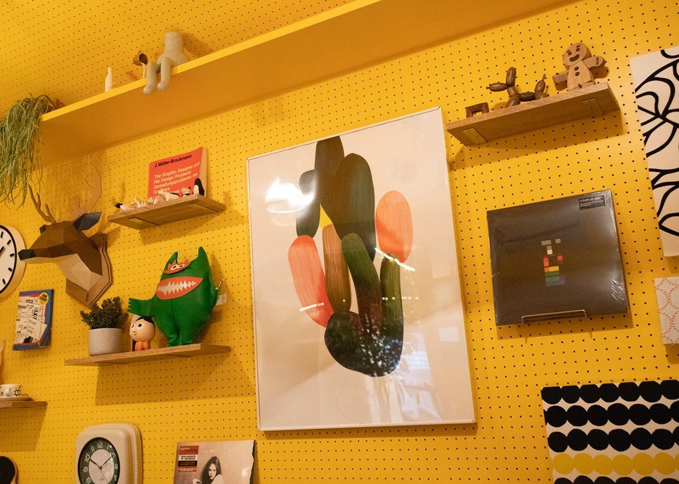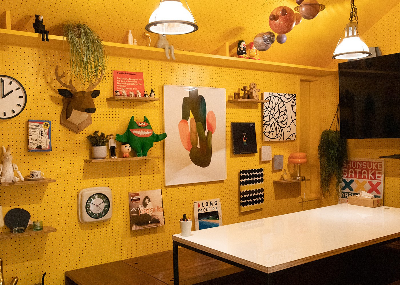 まず部屋に入ってすぐ目にとまる特徴的な黄色い壁。この会議室は、全面有孔ボードになっていて絵画や雑貨類を飾っています。そして飾ってある雑貨は全て弊社社員がそれぞれ選んだものであり、各々の「クリエイティブ偏愛」に基づいて選んだ雑貨です。