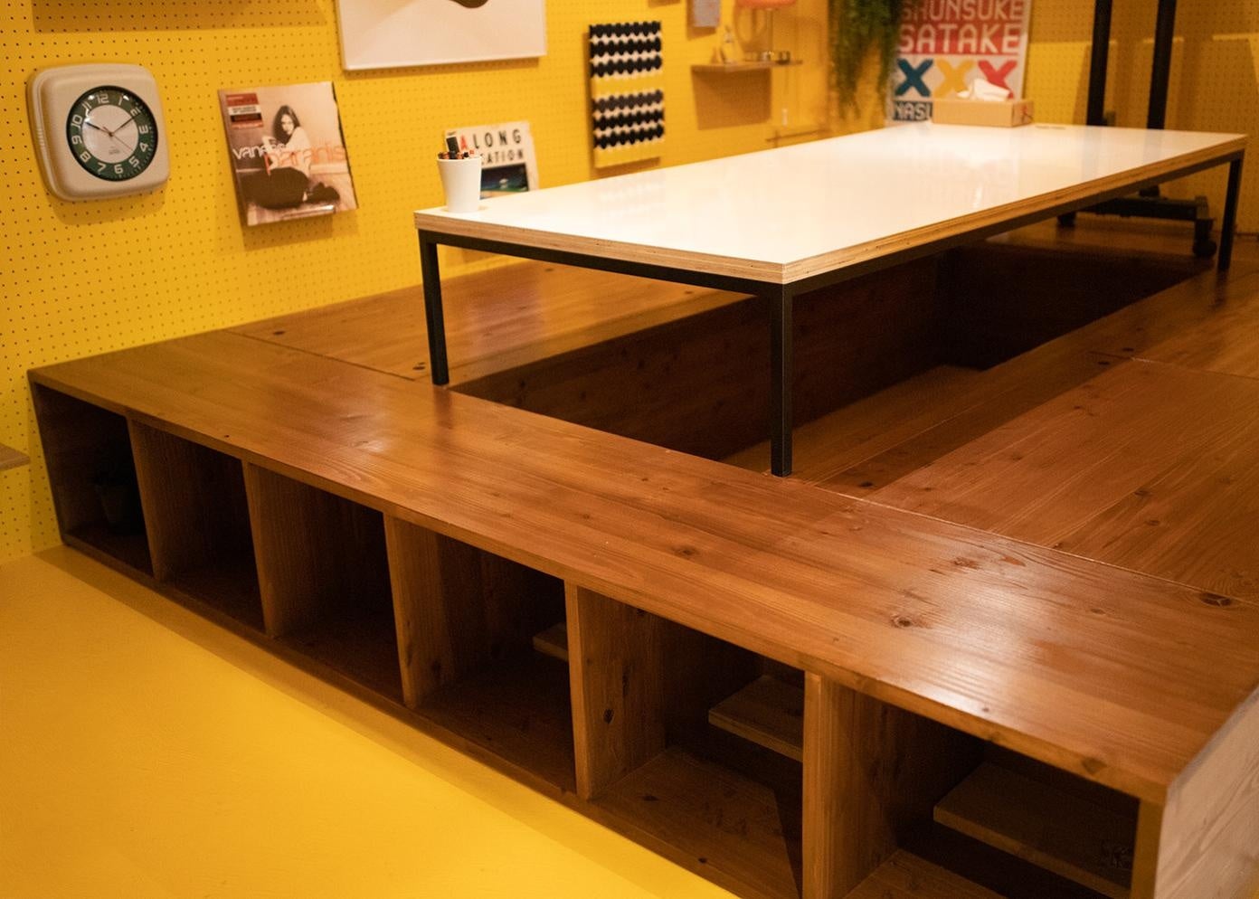 堀ごたつ式の小上がりを採用することによって、履物を脱いで仕事ができる場所を作りました。自宅にいる時の様にリラックスしながら、創作や会議に臨むことができます。