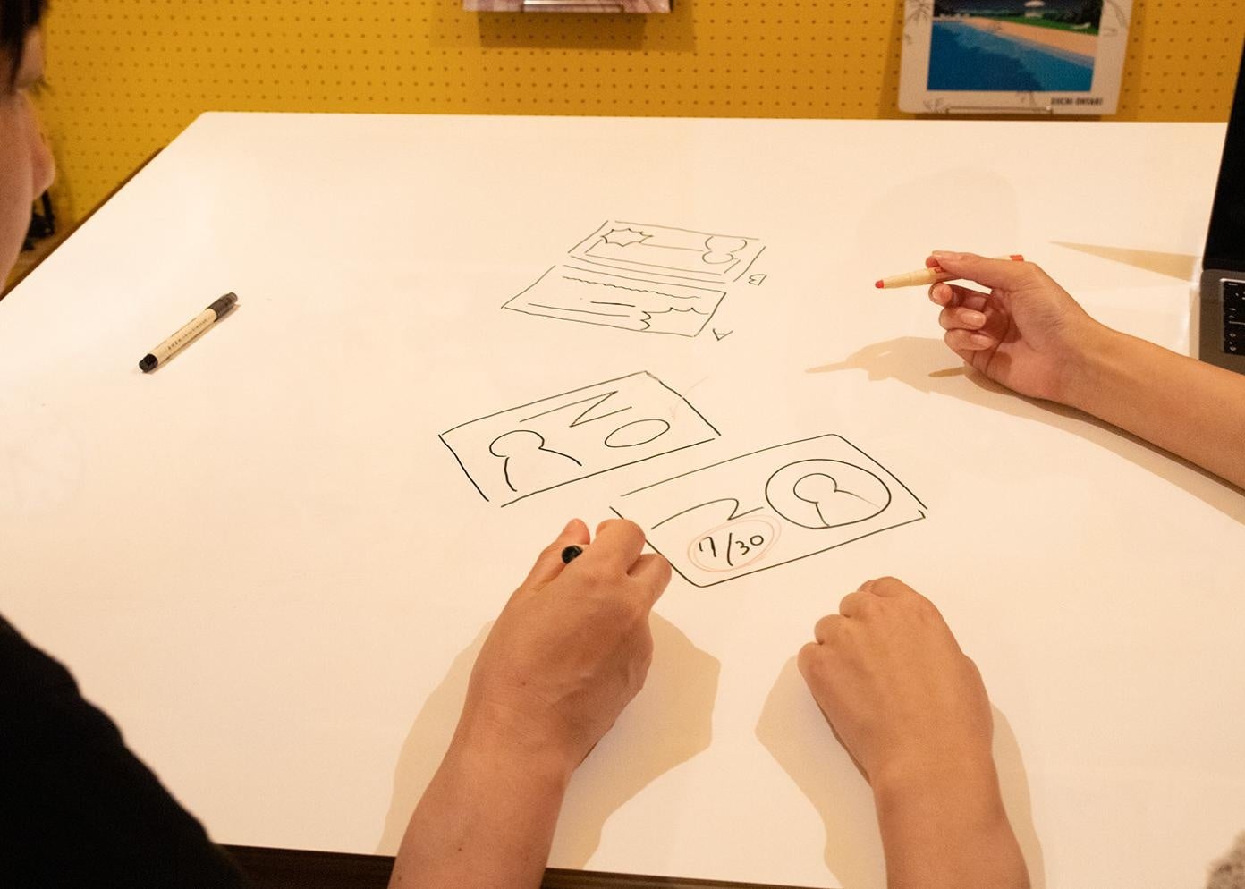 真ん中にある作業デスクは、ホワイトボード仕様になっています。会議中に思いついたアイデアをすぐに書きたい時、メンバー間で言葉だけではなくイメージの共有を行いたい時など、様々な場面でこのホワイトボードデスクは活用されています。