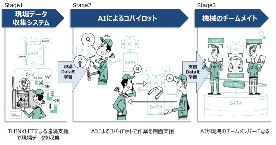 このような状況下、当社は「Stage1:遠隔支援で経営効果を出しつつデータがたまる」、「Stage2:AIによるコパイロット(※副操縦士のように、現場作業を側面支援すること)」、「Stage3:機械がチームメイトになる」の3段階を踏むことで、熟練工AIを実現し世界に届けることを目指しています。
