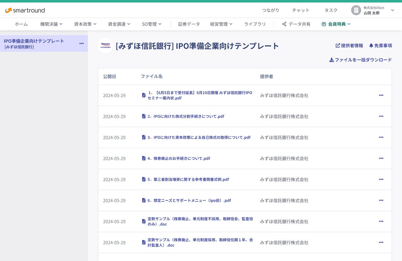 専門家のノウハウを無料で閲覧できる「テンプレート・資料集」をsmartroundユーザー限定で公開。みずほ信託銀行提供のIPO準備に必要な株式事務手続、定款、規程等のテンプレートを閲覧できます。