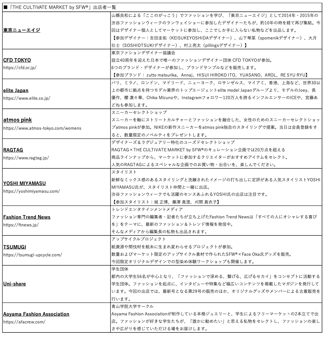 「THE CULTIVATE MARKET by SFW®」は、渋谷ファッションウィークがこれまでの13年の歴史で積み重ねてきたネットワークを活かし、渋谷ファッションウィークのランウェイショーに参加したファッションデザイナーやインフルエンサー、スタイリスト、ブランド、学生サークル、日本で唯一のファッションデザイナー団体CFD TOKYOやアップサイクルプロジェクト「TSUMUGI」など、多様な分野で活躍する顔ぶれが出店します。会場では、出店団体の想いが詰まった私物やTシャツ、アクセサリーなどのファッションアイテム、グッズなど、ここでしか出合えない商品が並び、単なる物の売買にとどまらず、会話が生まれ価値観が交差しヒトモノコトが出合い、訪れる人も自然と仲間になっていくような関係を育てる場を目指します。