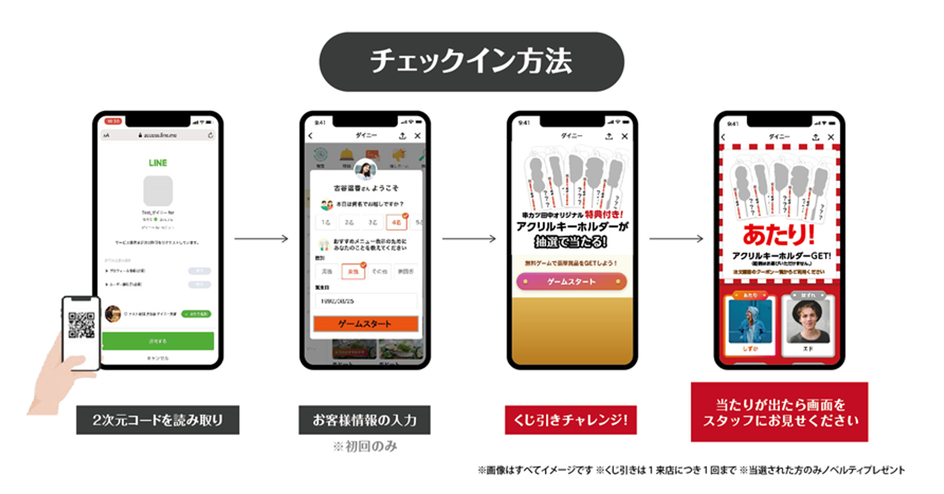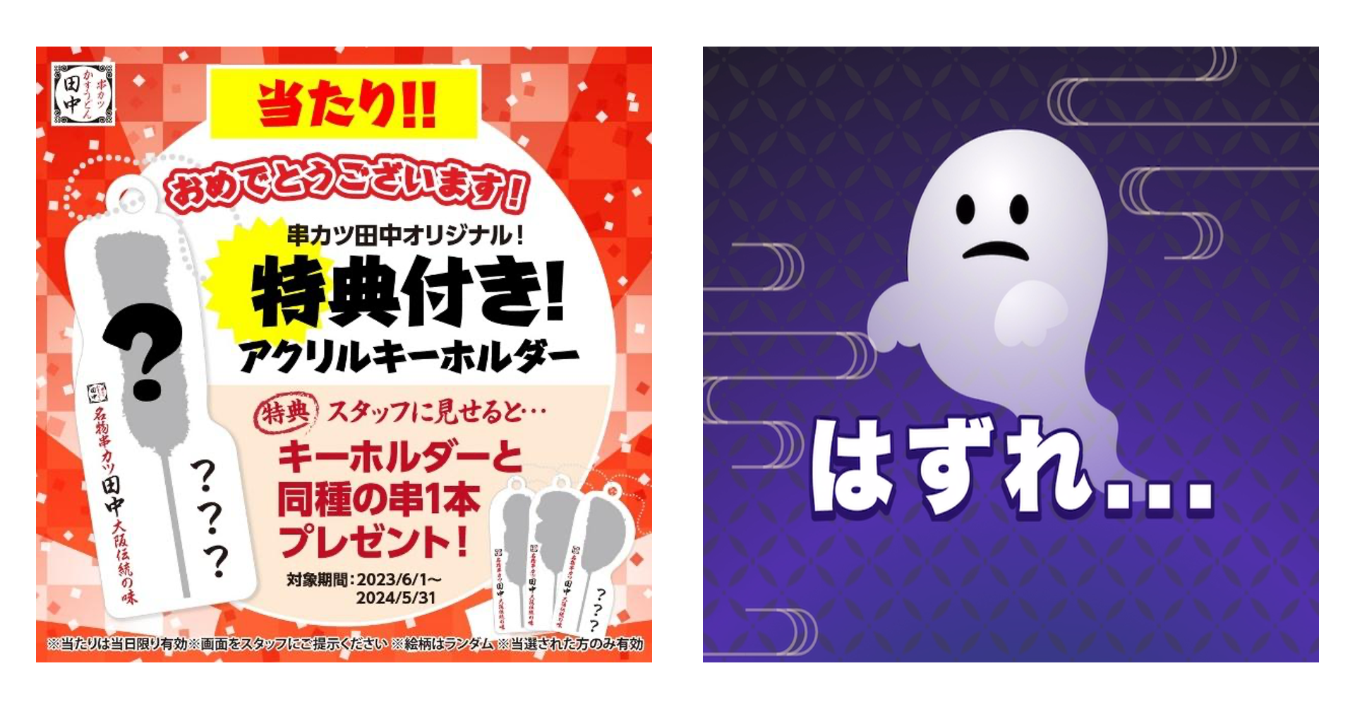 串カツ田中では、2023年6月12日(月)からは、「当たり」の画面が出たら、全5種類ある「特典付きアクリルキーホルダー」を1つプレゼントいたします。アクリルキーホルダーにはそれぞれ串カツがプリントされており、スタッフにご提示いただくと、同種の串カツを1本プレゼントいたします。