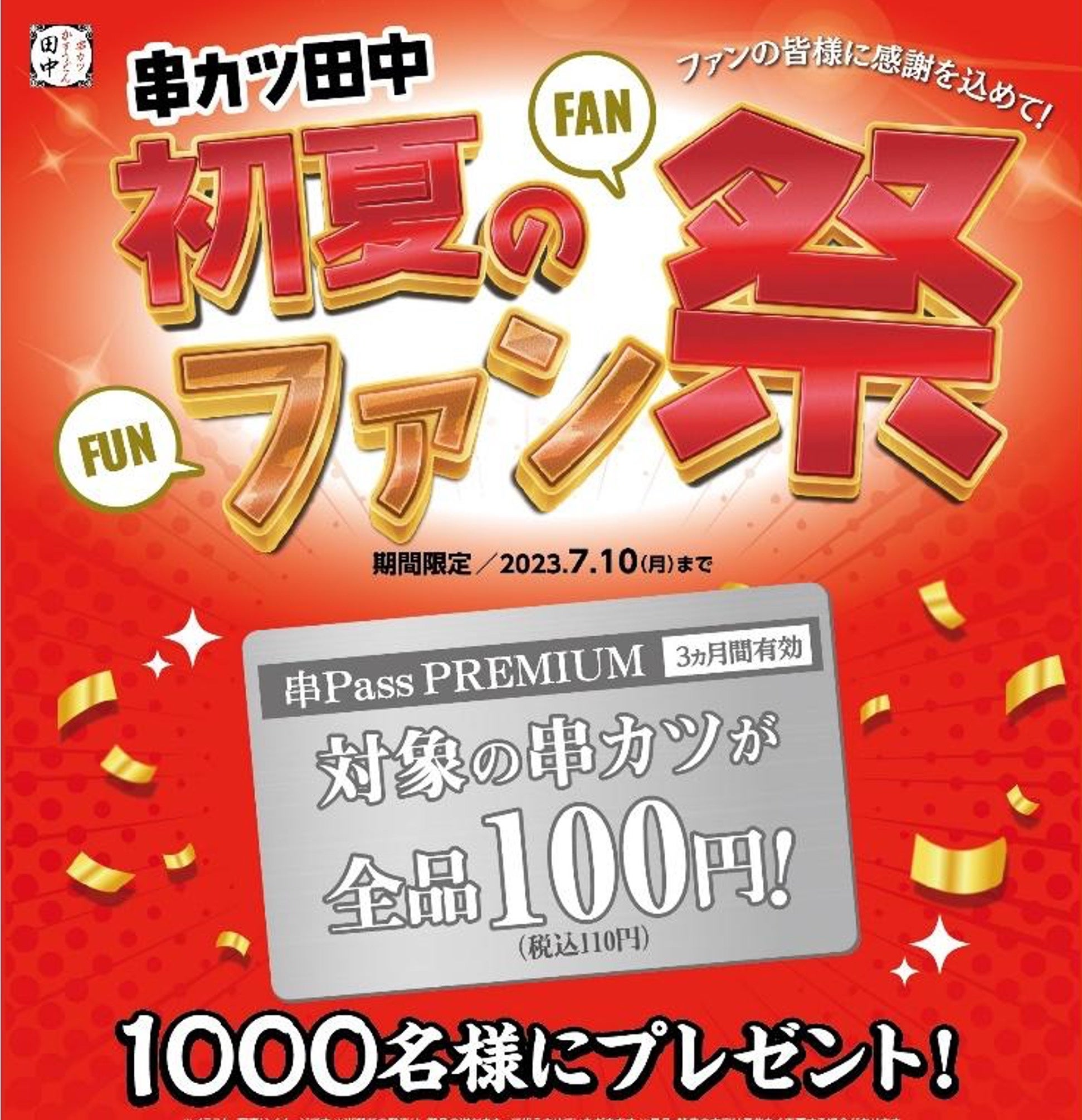 このサービスを記念して、2023年6月12日(月)~7月12日(水)の期間で「串カツ田中 初夏のファン祭」キャンペーンを実施します。期間中にチェックインしていただいたお客様全員を対象に、串カツが100円(税込110円)になる「串Pass PREMIUM」を抽選で1,000名様へプレゼントいたします。