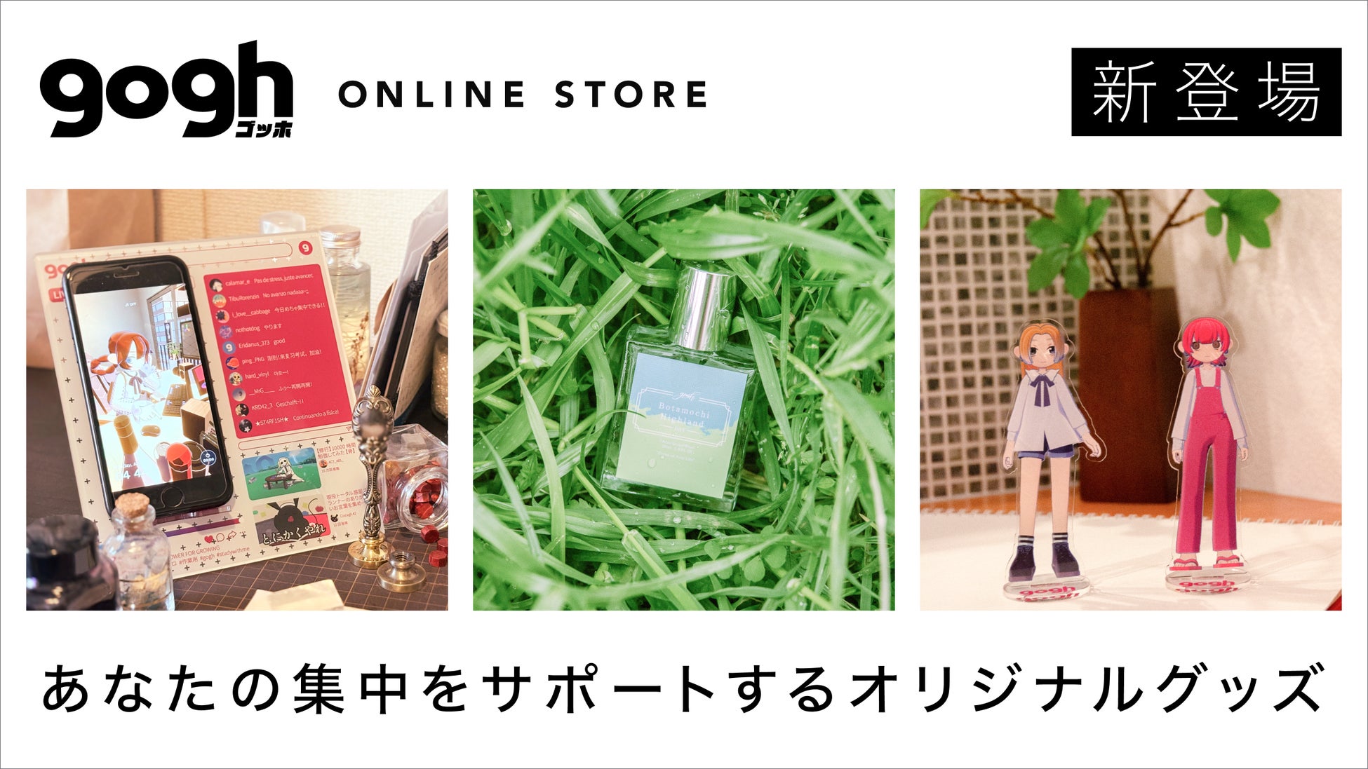 今回のラインナップでは、goghを表示したままスマートフォンを立てかけて使用できる「アクリルスマホスタンド」、人気スペース「ボタモチ高原」をイメージした香りの「ルームフレグランス」が新たに追加。さらに、前回販売時に即完売となった「マイアバターアクリルスタンド」の再販も決定しました。