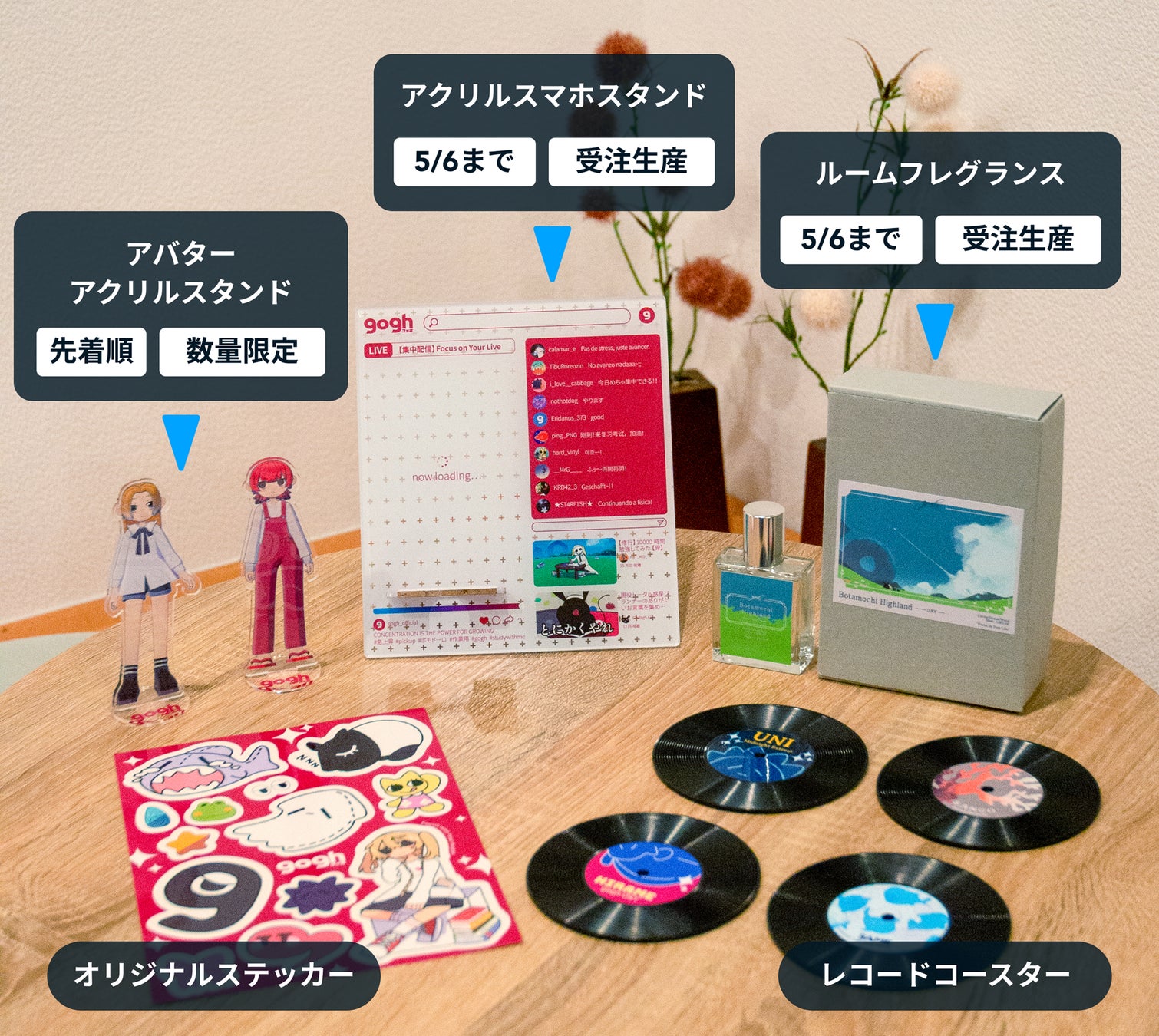 また、定番人気の「goghオリジナル A5サイズステッカー」「goghプレイリスト レコード型コースター」、そして復刻販売となる「マイアバターアクリルスタンド」も販売いたします。