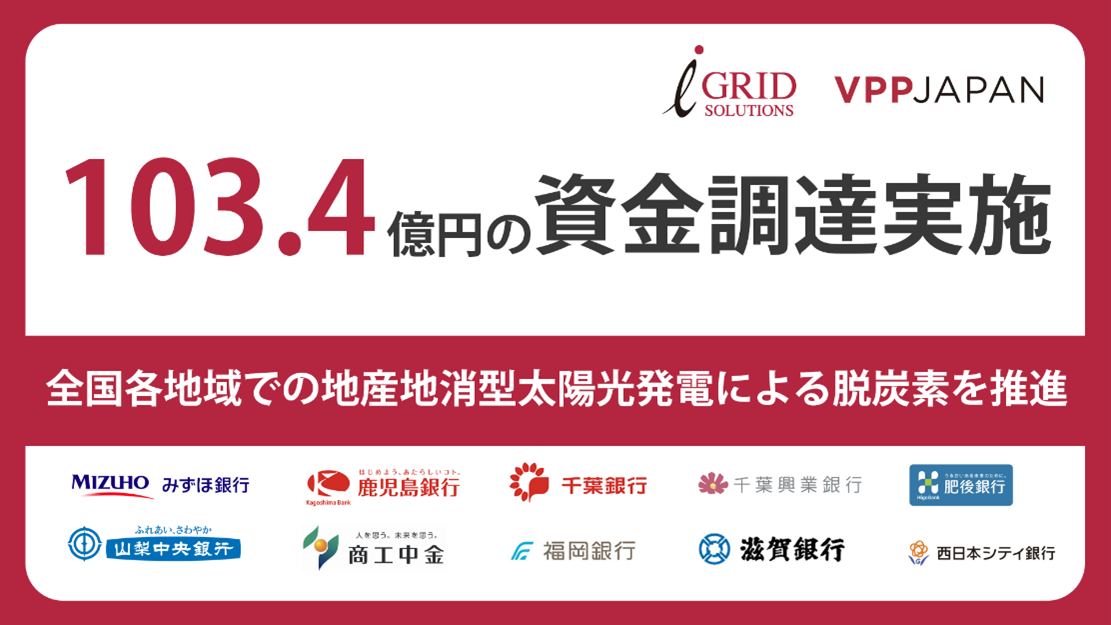 グリーンテックを推進し、グリーンエネルギーが地域をめぐるサスティナブルな世界の実現を目指す株式会社アイ・グリッド・ソリューションズ(本社:東京都千代田区、代表取締役社長:秋田 智一、以下「アイ・グリッド」)の子会社株式会社VPP Japan(本社:東京都千代田区、代表取締役:秋田 智一、以下:VPPJ)は、株式会社みずほ銀行(取締役頭取(代表取締役): 加藤 勝彦、以下:みずほ銀行)をアレンジャーとしたシンジケートローンによる総額103.4億円の資金調達を実施し、2020年の第一弾の資金調達と合わせて累計203.4億円の調達を完了したことをお知らせいたします。