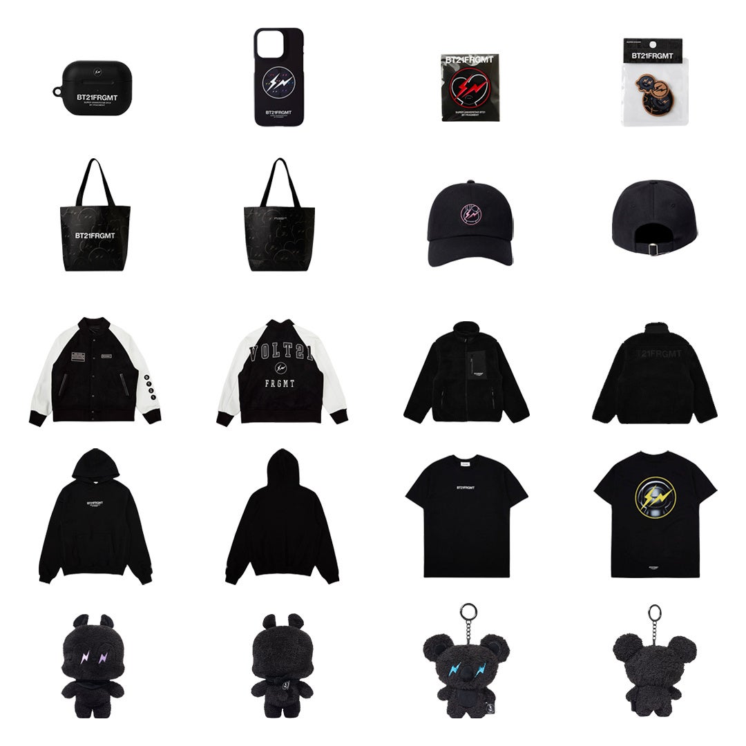 今回の「BT21 X FRAGMENT」では、fragment designらしいブラックのボディのキャラクターに、ブランドの象徴的なサンダーボルトロゴをあしらったキャラクターデザインがこれまでにないスタイルのBT21を表現しています。小物からアパレルアイテムまで、二つの異なるブランドが織りなすスタイリッシュなアイテムを取り揃えています。