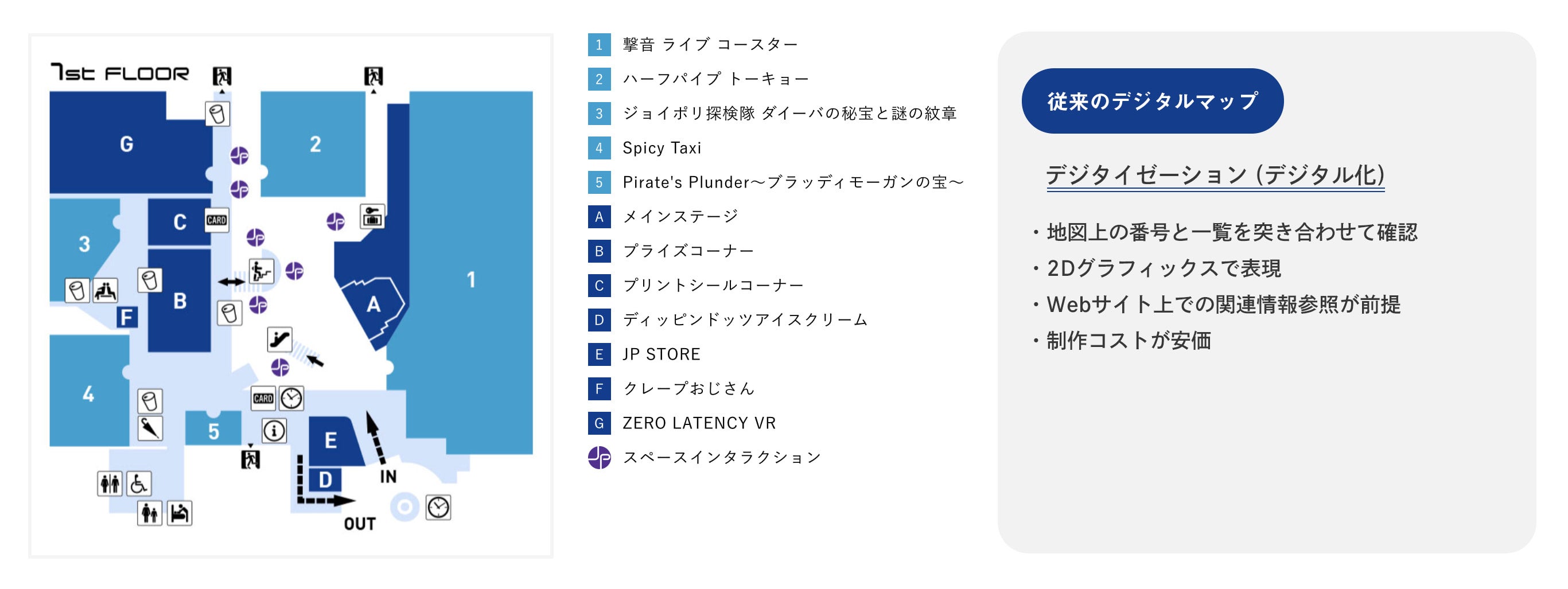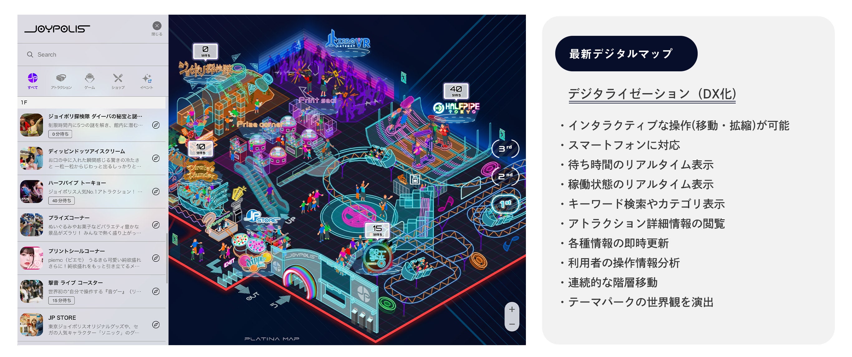 表現の自由度が高いデジタルマップ・プラットフォーム「プラチナパーク」の採用により、東京ジョイポリスの世界観を演出したデジタルマップが誕生しました。従来型のデジタルマップは、フロアグラフィックに記載された番号と一覧表を突き合わせる形式が一般的で、紙のフロアガイドをWEBサイト上で閲覧できる「デジタイゼーション」までの対応となっていました。プラチナパークでは、制作過程に紙の思考を入れないフルデジタルを前提にした制作方式で、インタラクティブかつ、リアルタイム情報連携による「デジタライゼーション」にて、これまでにない全く新しい体験価値を提供することができます。
