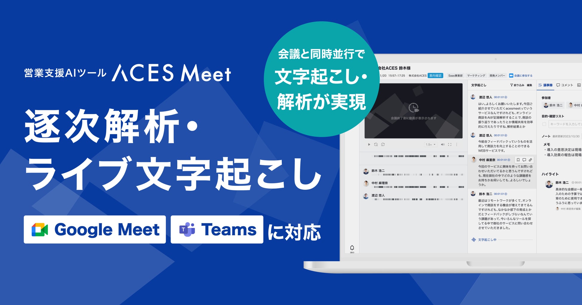 株式会社ACES(東京都文京区、代表取締役 田村 浩一郎、以下「ACES」)は、商談解析AIツール「ACES Meet」において、商談と同時並行での議事録書き起こしおよび商談解析が可能になりました。これにより、商談中や商談終了後すぐに書き起こしを確認でき、商談の結果を共有いただけるようになりました。