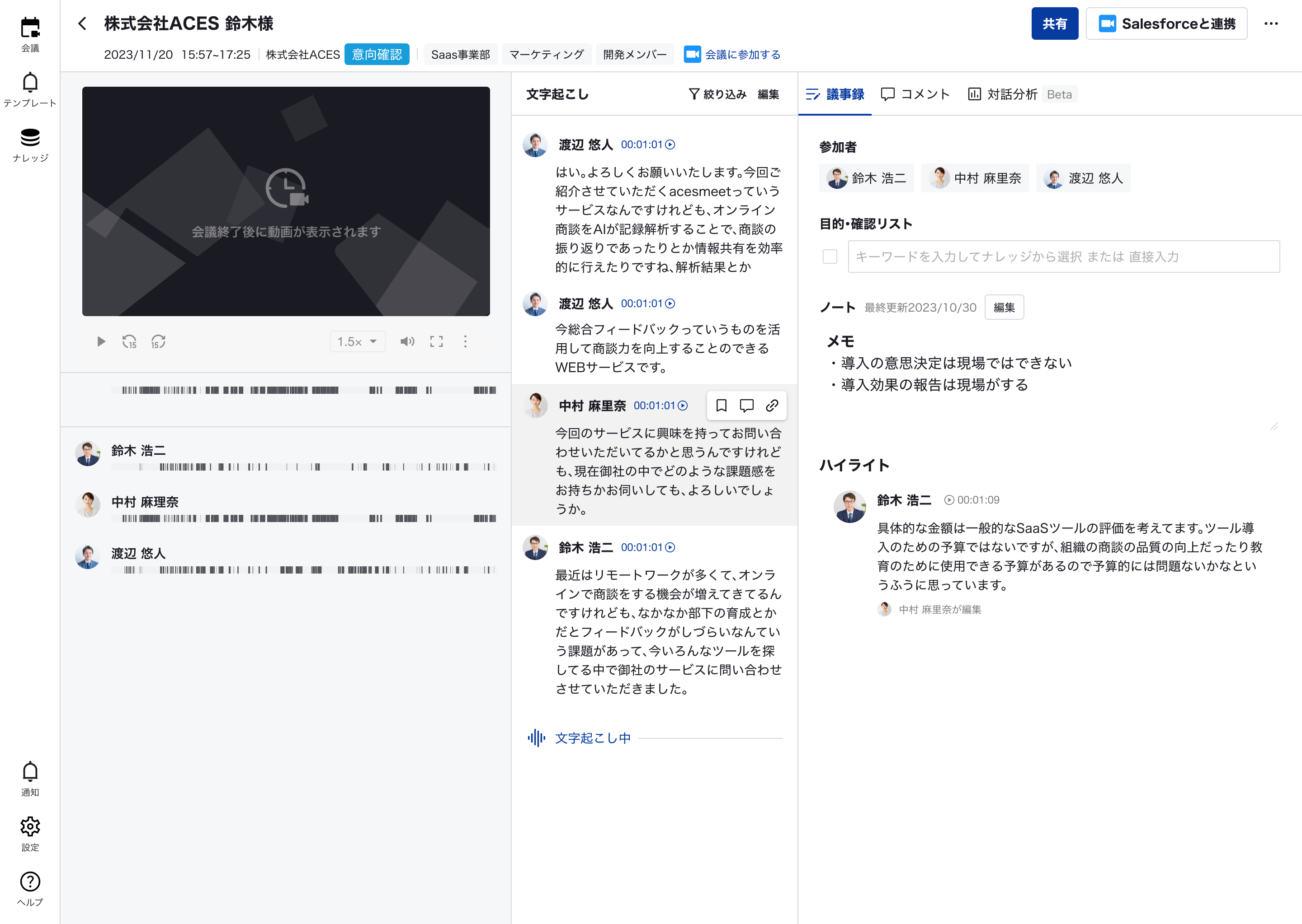 ACESは、オンライン会議を録画し、独自AIによる話者ごとの自動書き起こしや重要なシーンの可視化を行うことで、オンライン商談における成約率の向上と現場の工数削減に寄与する営業支援AIツール「ACES Meet」を幅広い業界のお客様にご提供しております。
